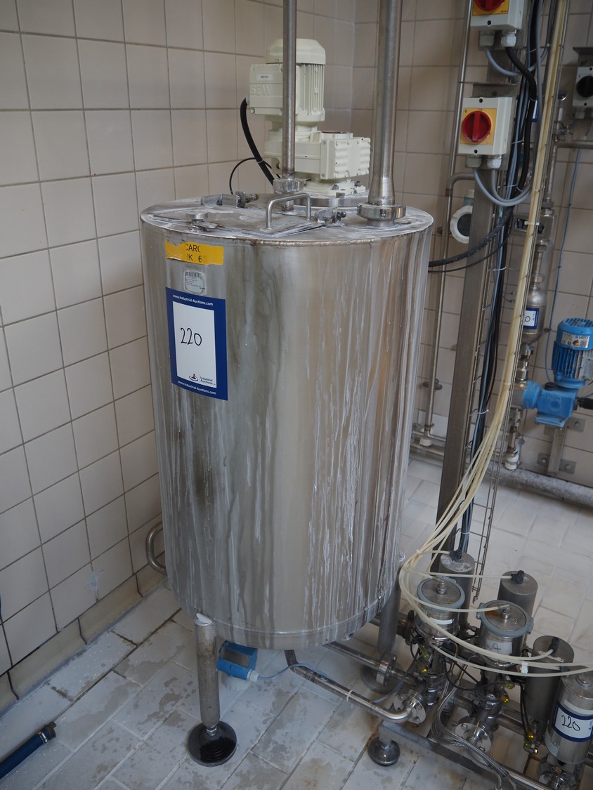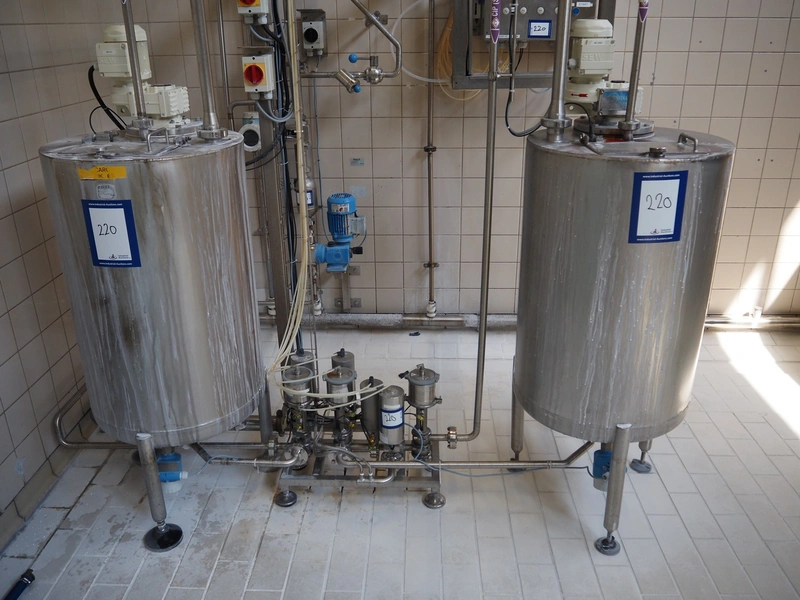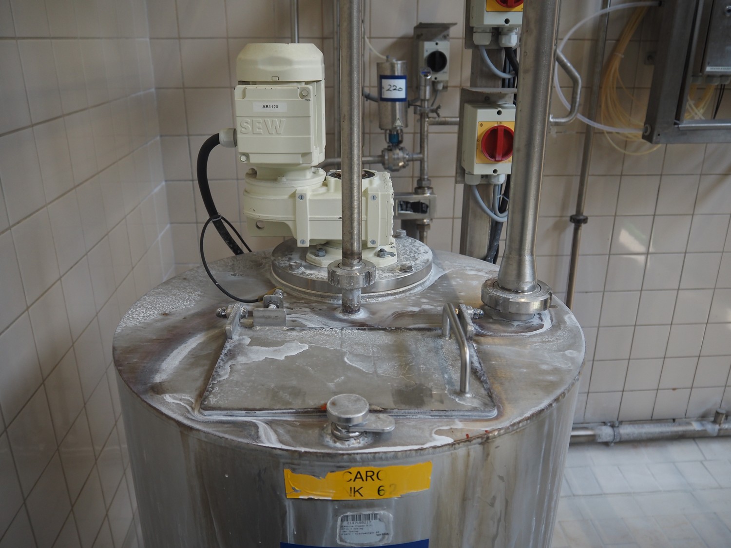 Natural colouring mixing installation consisting of 2 s/s tanks with agitator, inside dimensions: (2x) ø 590 mm x 850 mm, dimensions tanks: (2x) ø 600 mm x 1650 mm, manifold with 7 GEA Tuchenhagen GmbH valves, Sera GmbH dosing pump, Endress+Hauser flowmeter, type: PROMAG A and APV s/s control cabinet.
