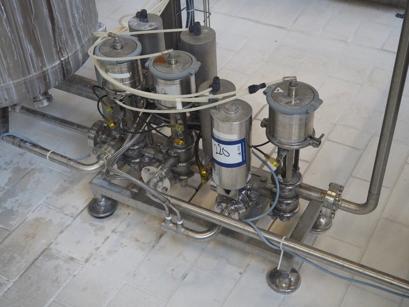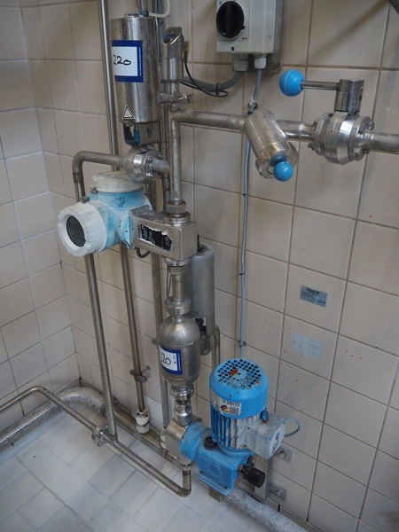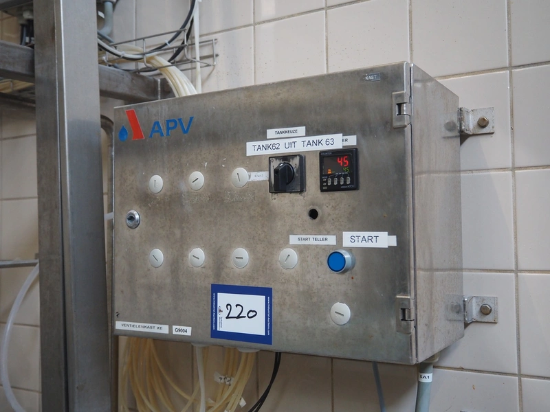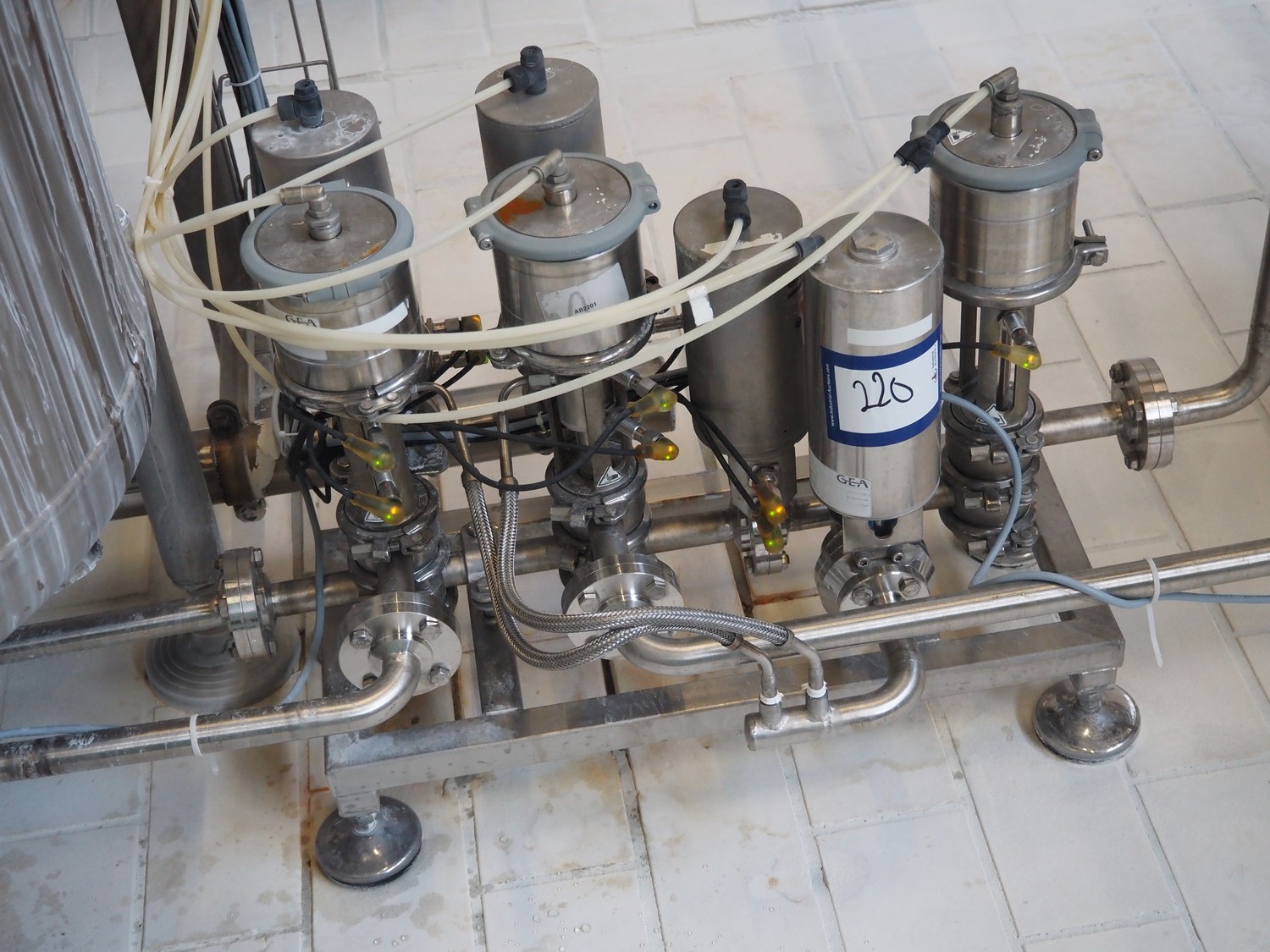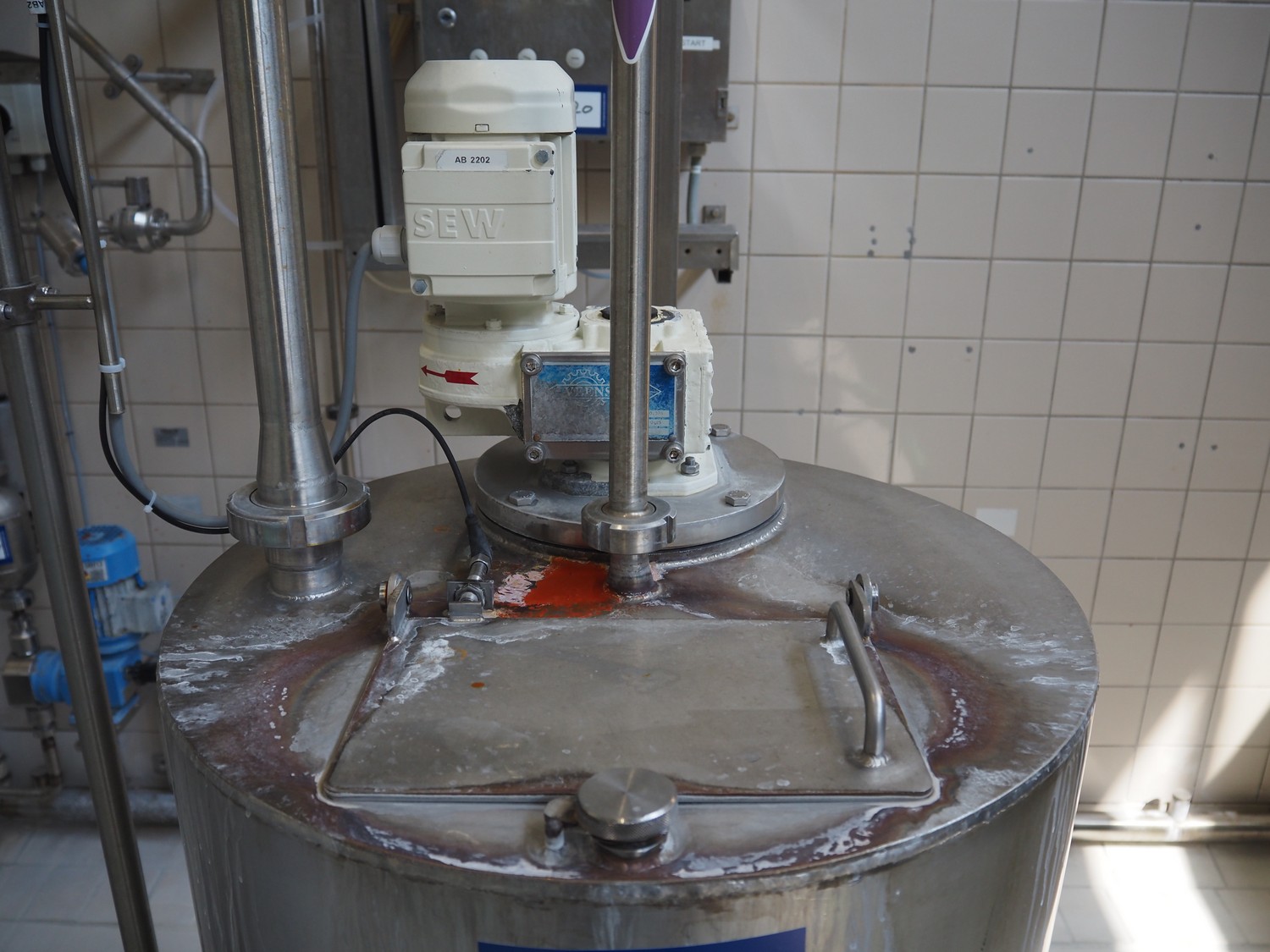 Natural colouring mixing installation consisting of 2 s/s tanks with agitator, inside dimensions: (2x) ø 590 mm x 850 mm, dimensions tanks: (2x) ø 600 mm x 1650 mm, manifold with 7 GEA Tuchenhagen GmbH valves, Sera GmbH dosing pump, Endress+Hauser flowmeter, type: PROMAG A and APV s/s control cabinet.