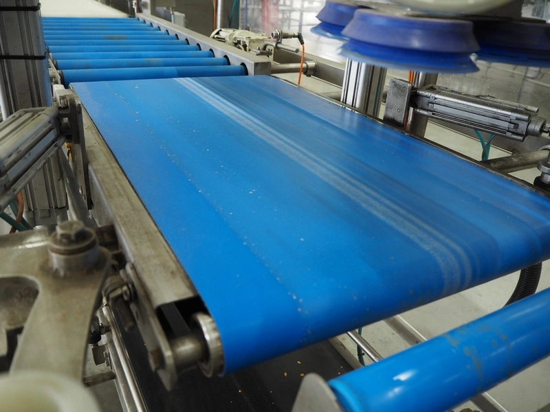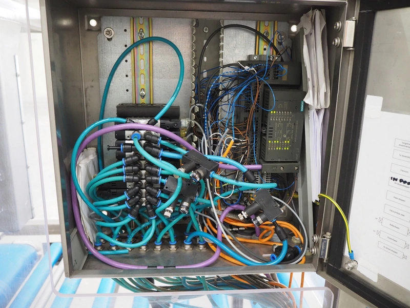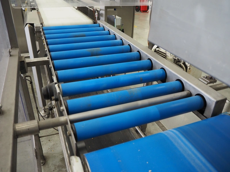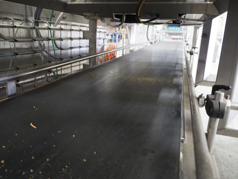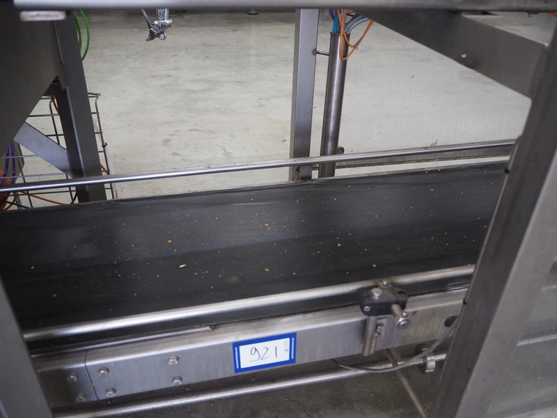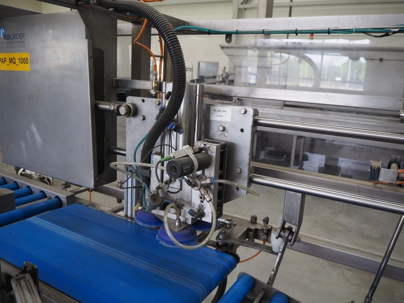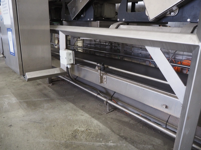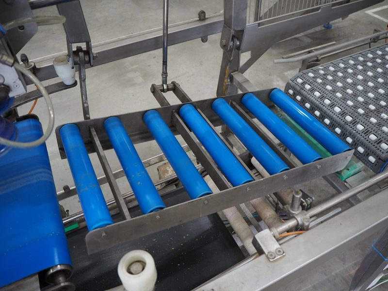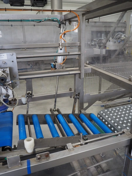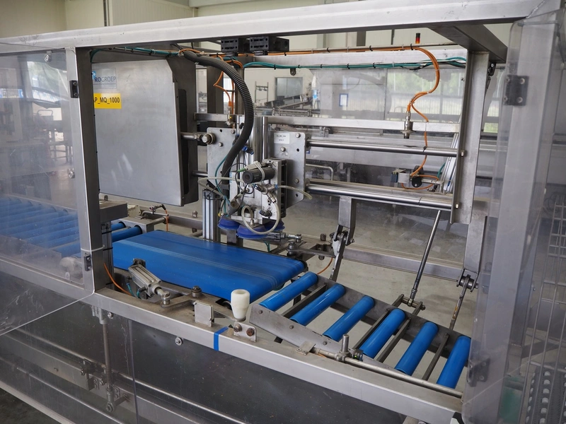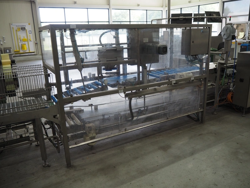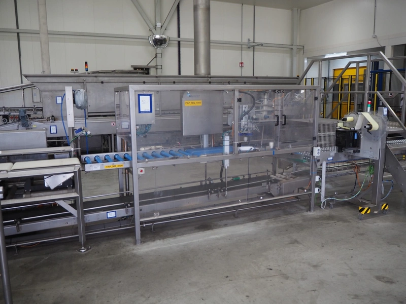RO Group box packaging machine for cheese wheels, electric driven roller conveyor, plastic rollers, roller width: 450 mm, plastic belts, belt width: 450 mm and 400 mmm, plastic rollers, roller width: 350 m, total dimensions: 3900 mm x 1000 mm x 1700 mm.