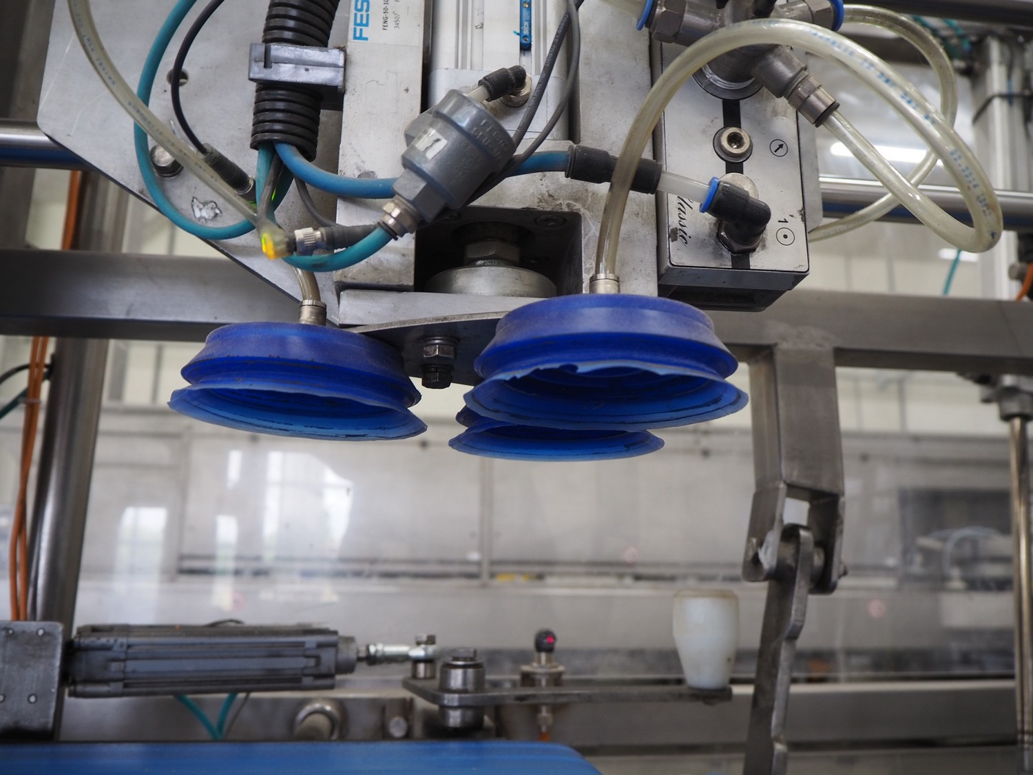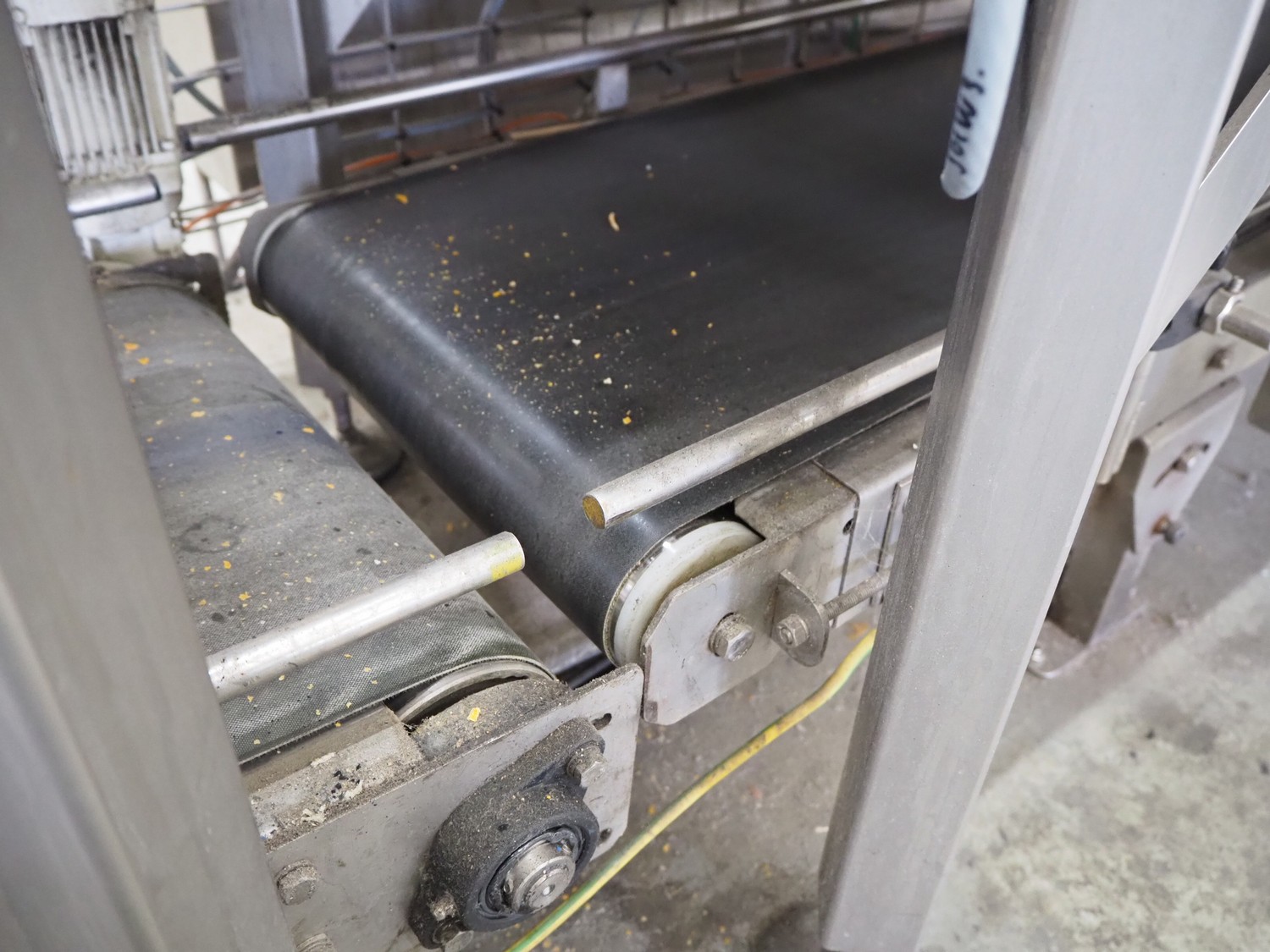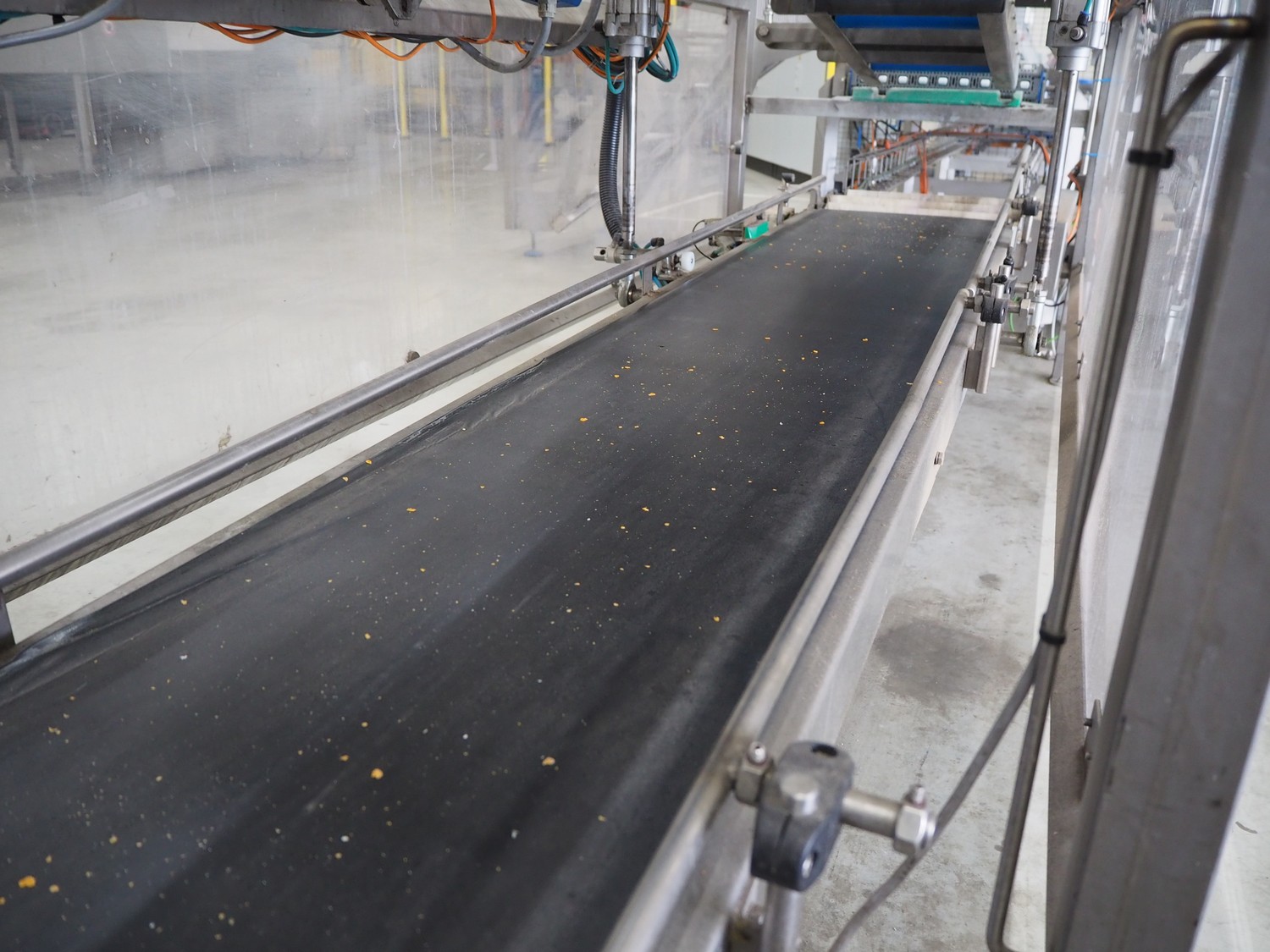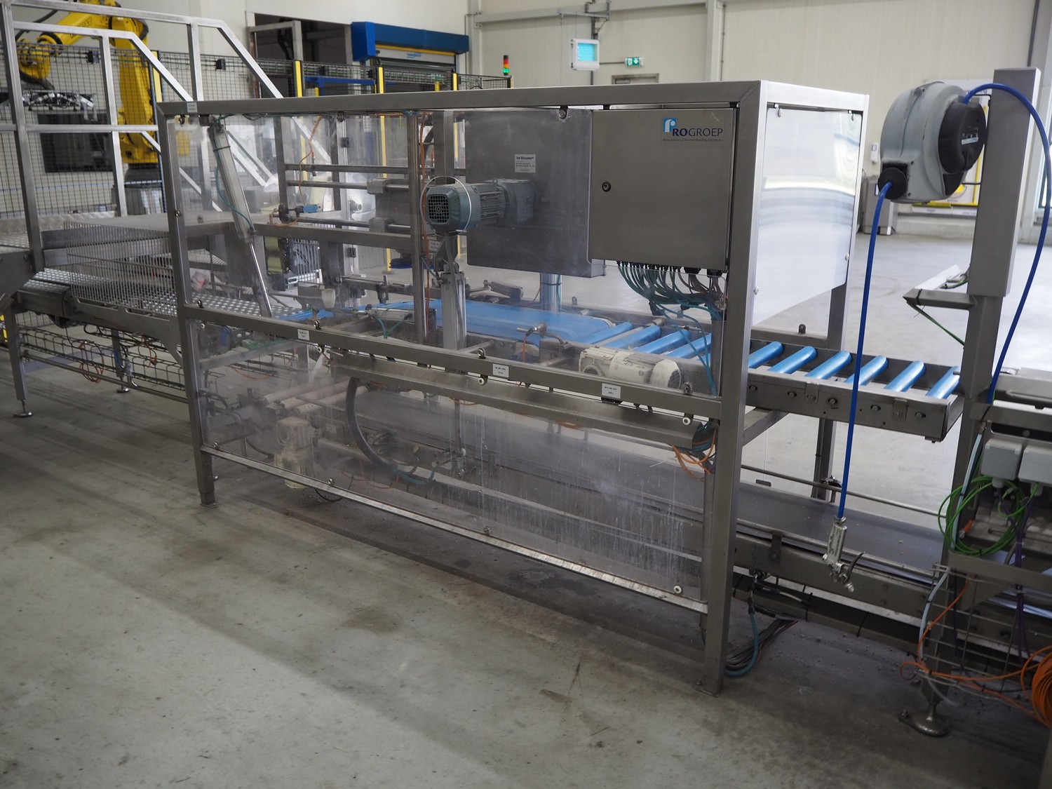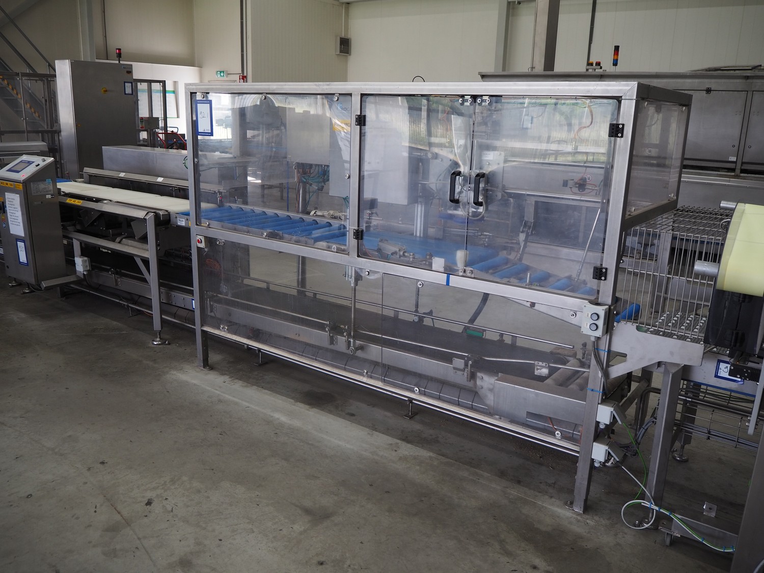 RO Group box packaging machine for cheese wheels, electric driven roller conveyor, plastic rollers, roller width: 450 mm, plastic belts, belt width: 450 mm and 400 mmm, plastic rollers, roller width: 350 m, total dimensions: 3900 mm x 1000 mm x 1700 mm.