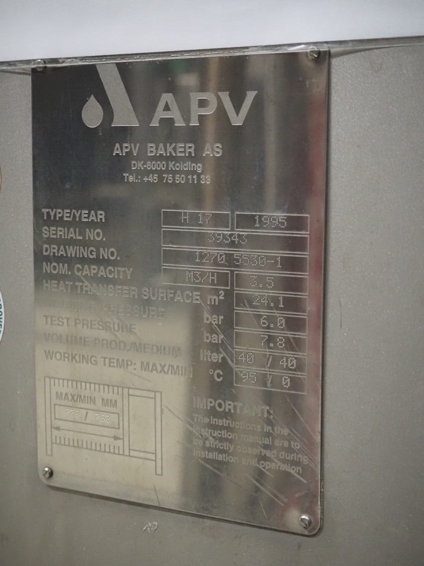 APV cream pasteurizer, type: H17, serial number: 39343, year of construction: 1995, capacity: 3.5 m³/h, dimensions: 1500 mm x 700 mm x 1400 mm.
