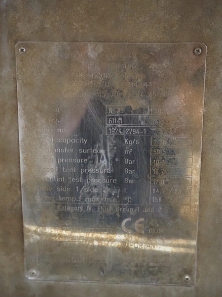 APV Products whey cream pasteurizer, type: N 35, serial number: 61141, year of construction: 2004, nominal capacity: 2.78 m/s, transfer surface: 59.5 m², working pressure: 10.0 bar, dimensions: 1600 mm x 900 mm x 1700 mm.