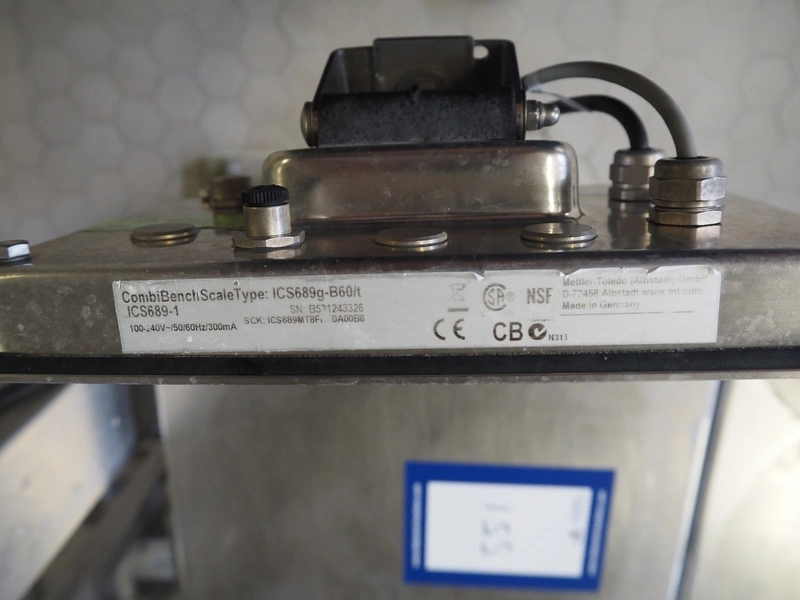 Mettler Toledo weighing scale, model: CombiBenchScale, type: ICS689g-B60/t, serial number: B531243326, 100-240 V, 50/60 Hz, 300mA, dimensions: 560 mm x 500 mm x 1250 mm.