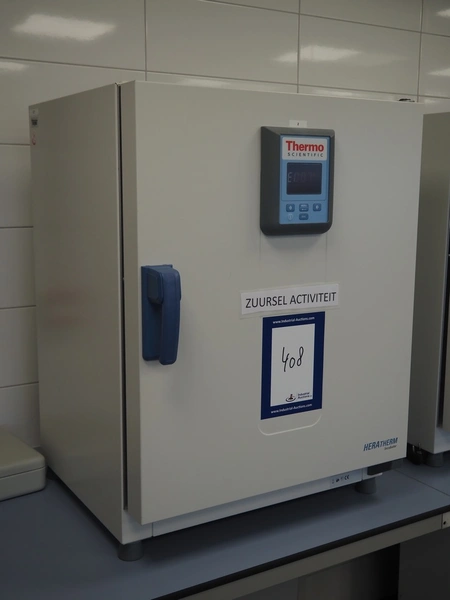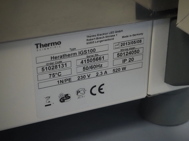 Thermo Scientific incubator, type: HERATHERM IGS100, serial number: 41505661, year of construction: 2013, 230 V, 1 Ph, 50/60 Hz, 2.3 A, maximum temperature: 75 °C, dimensions: 650 mm x 640 mm x 830 mm.