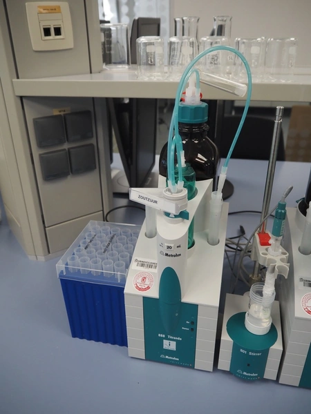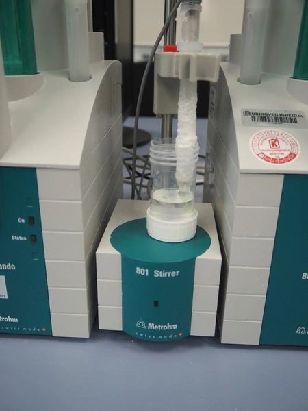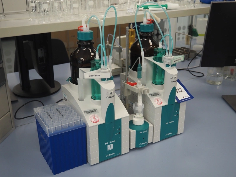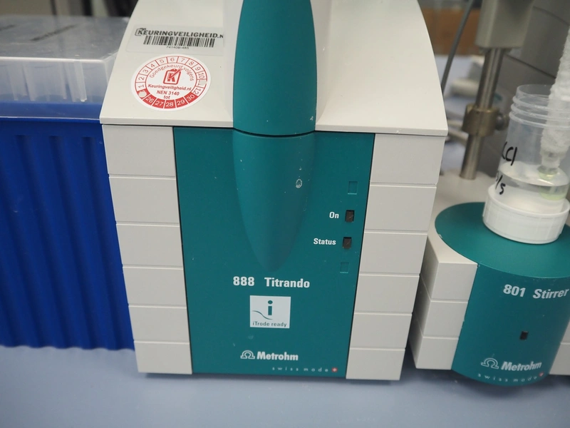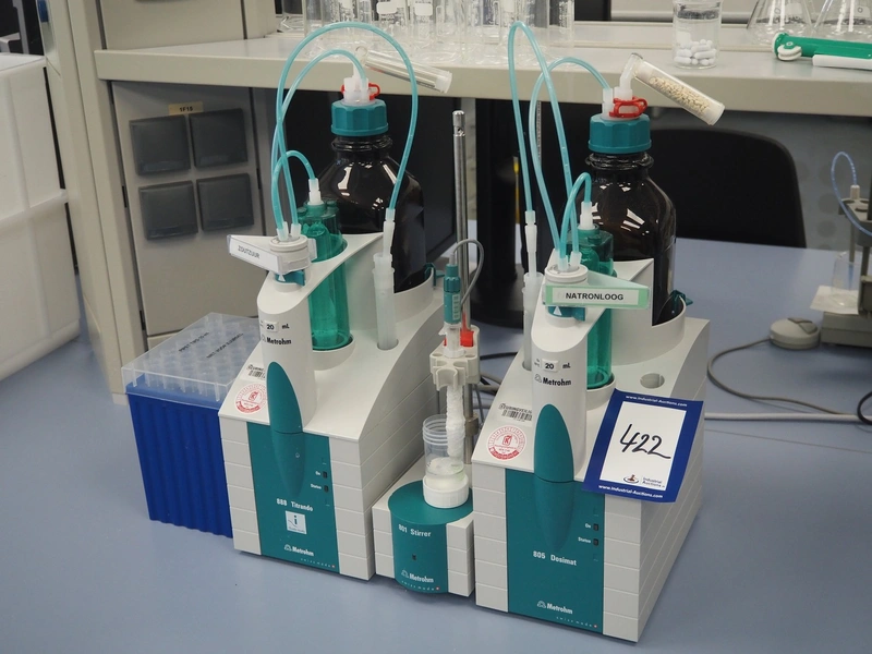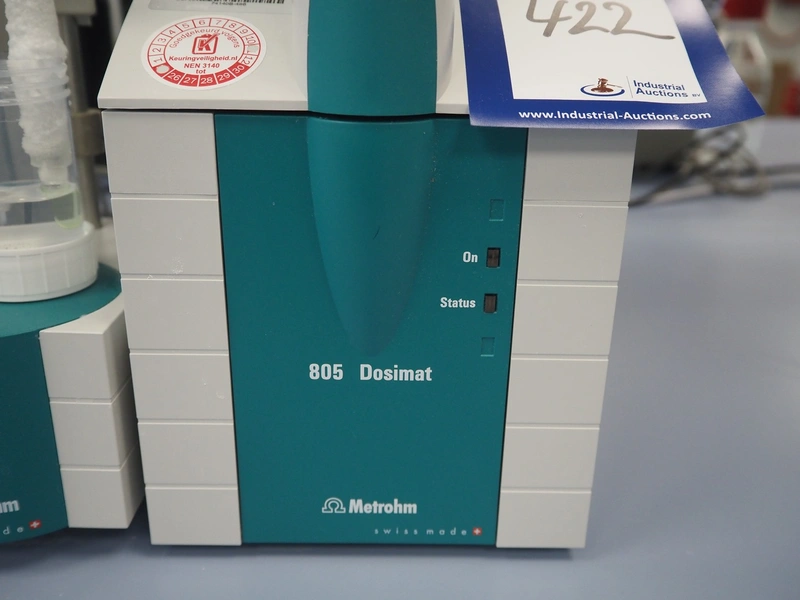 Metrohm dosing and titration system consisting of titrator, type: 888 Titrando, magnetic stirrer, type: 801 Stirrer and liquid handling station, type: 805 Dosimat, dimensions: (2x) 250 mm x 145 mm x 500 mm, 140 mm x 90 mm x 460 mm.