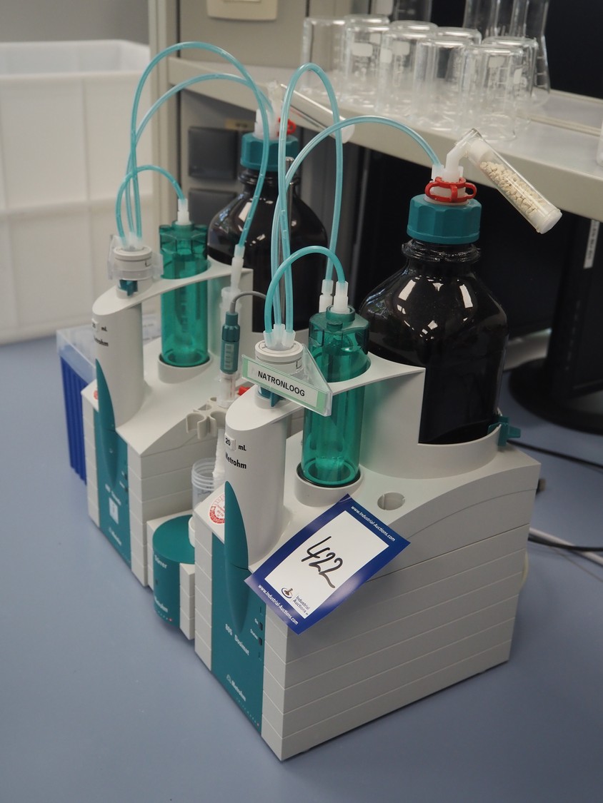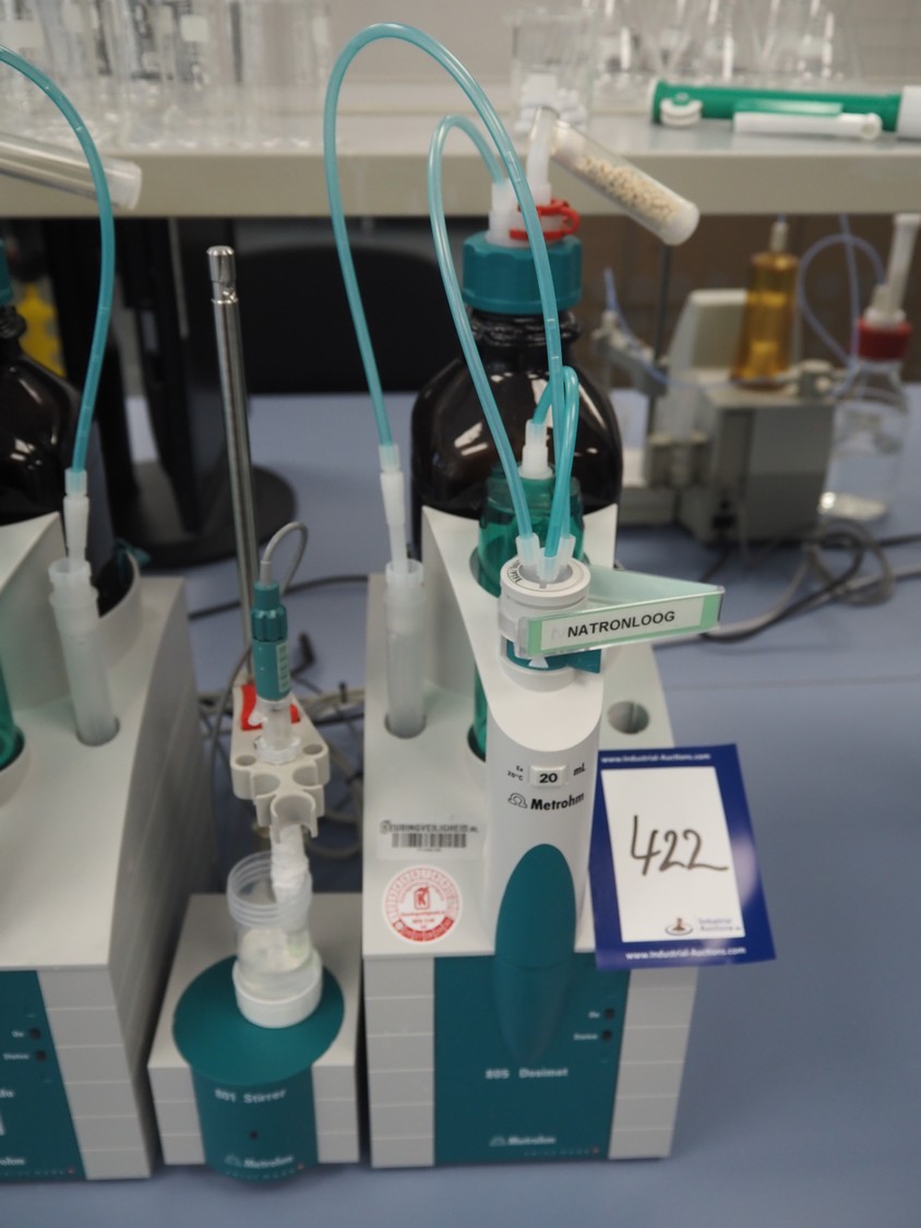 Metrohm dosing and titration system consisting of titrator, type: 888 Titrando, magnetic stirrer, type: 801 Stirrer and liquid handling station, type: 805 Dosimat, dimensions: (2x) 250 mm x 145 mm x 500 mm, 140 mm x 90 mm x 460 mm.