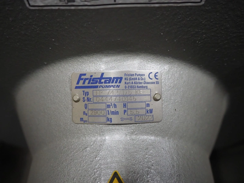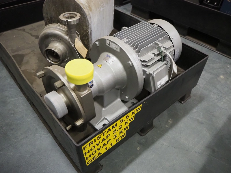 Pallet with 2 Fristam centrifugal pumps, type: FP 742/175 KF, serial number: 0444740145, year of construction: 2022, dimensions: 1200 mm x 800 mm x 600 mm.