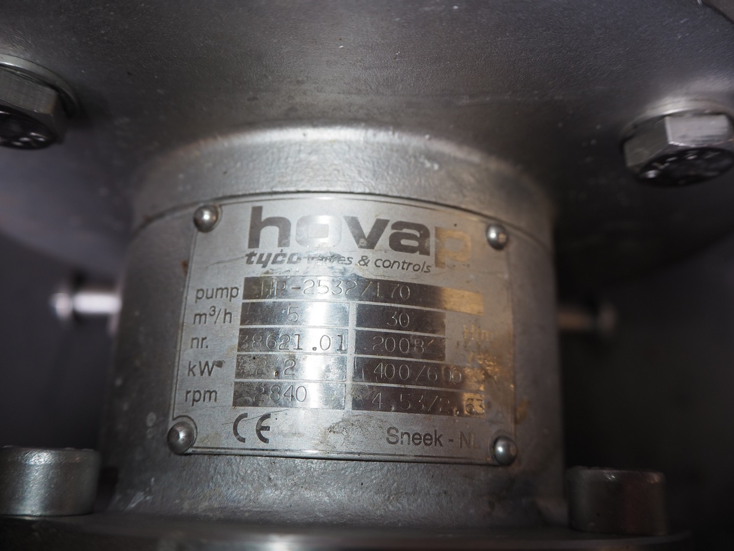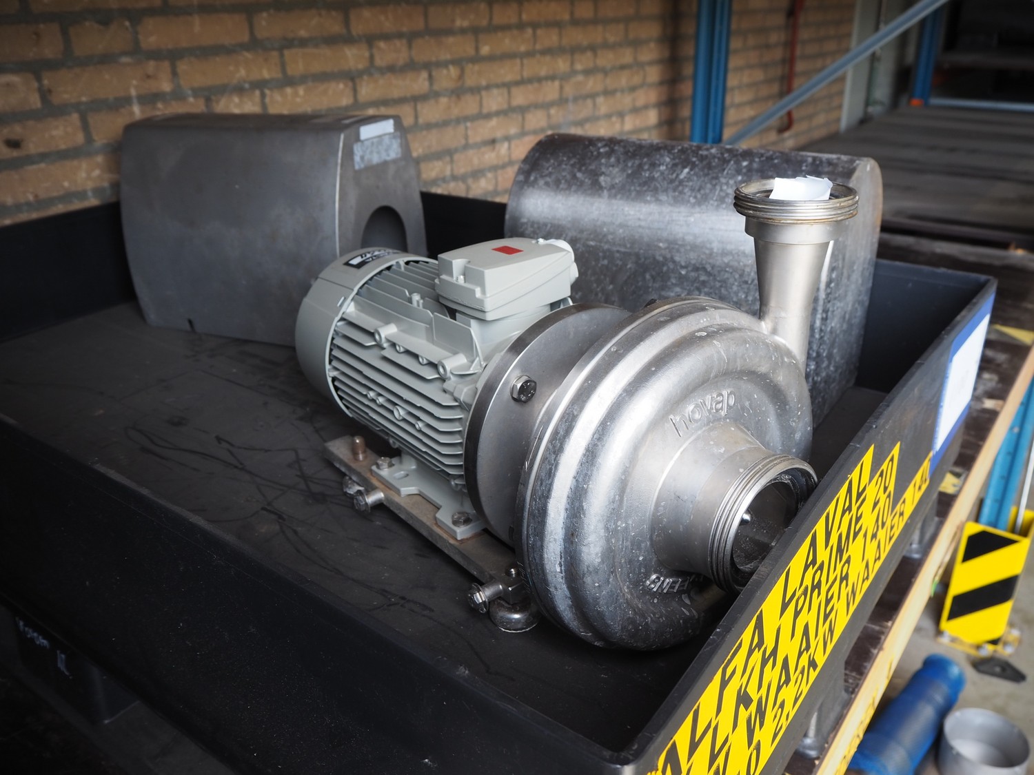 Pallet with Hovap pump and 2 covers, type: HP-25327, number: 38621.01, year of construction: 2008, capacity: 5 m³ per hour, dimensions: 1200 mm x 800 mm x 400 mm.