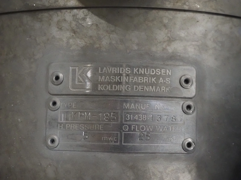 Lavrids Knudsen Maskinfabrik A/S centrifugal pump, type: KPM-185, machine number: 31438-13787, capacity: 25 m³ per hour, dimensions: 700 mm x 250 mm x 400 mm.