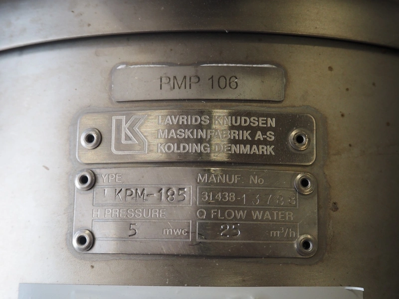 Lavrids Knudsen Maskinfabrik A/S centrifugal pump, type: KPM-185, serial number: 31438-13788, Q: 25 m³/h, dimensions: 650 mm x 250 mm x 450 mm.