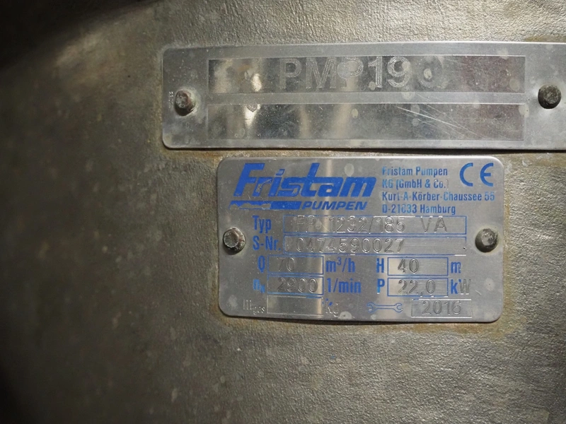 Fristam centrifugal pump, type: FP 1232/185 VA, year of construction: 2016, 22.0 kW, capacity: 70 m³ per hour, dimensions: 620 mm x 300 mm x 500 mm.