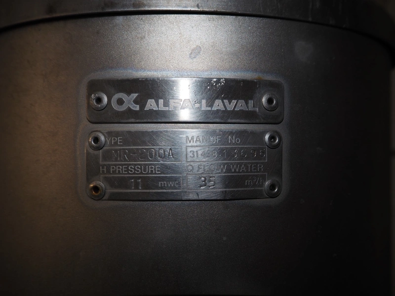 Alfa Laval centrifugal pump, type: MR-200A, serial number: 31438-13696, capacity: 35 m³ per hour, dimensions: 700 mm x 250 mm x 400 mm.