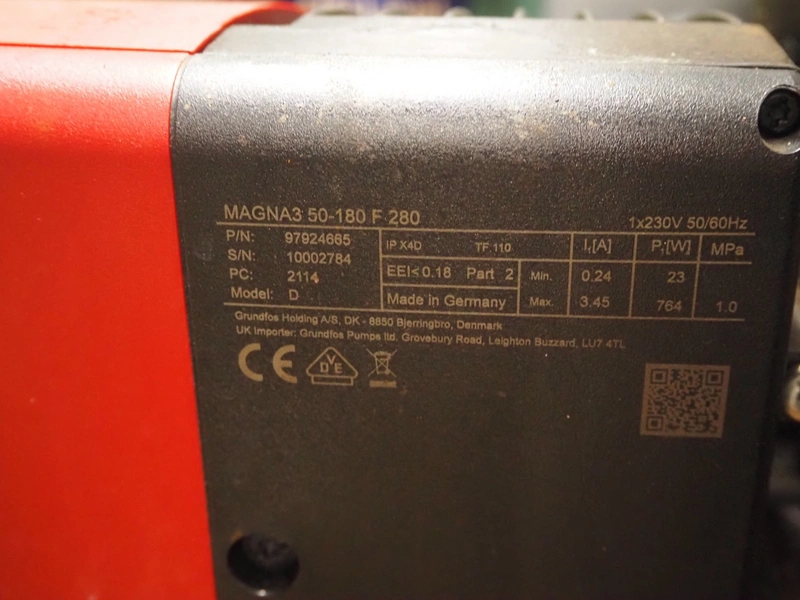Grundfos circulation pump, model: Magna3 50-180 F280, serial number: 10002784, 230 V, 1 Ph, 50/60 Hz, dimensions: 400 mm x 300 mm x 250 mm.