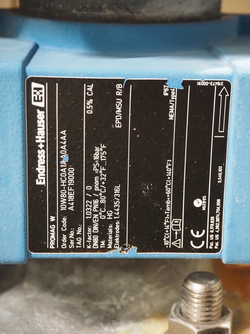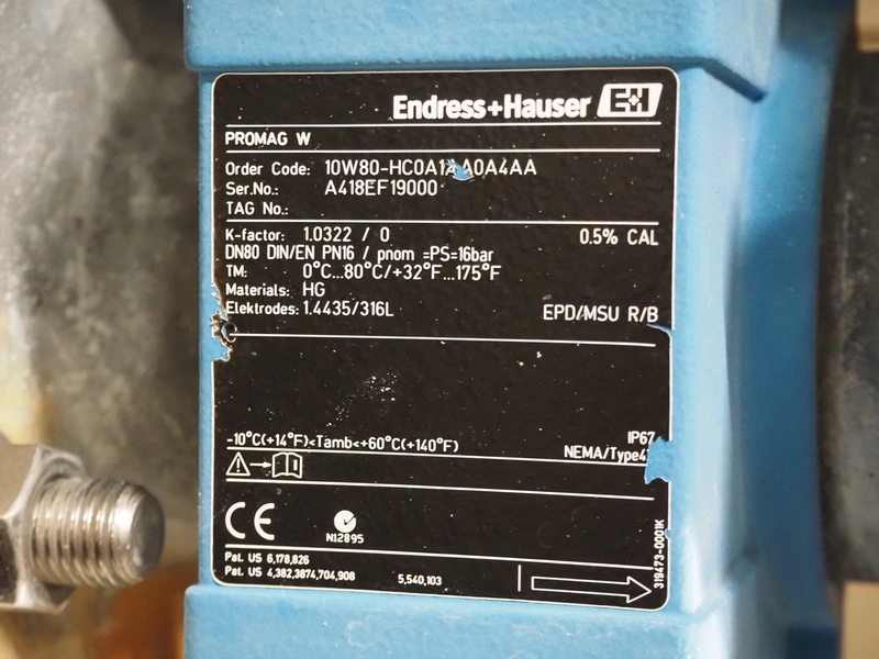 Endress+Hauser flowmeter, type: PROMAG W, serial number: A418EF19000, DN80, dimensions: 200 mm x 200 mm x 400 mm.