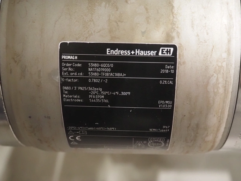 Endress+Hauser flowmeter with transmitter, type: PROMAG H, serial number: NA176D19000, DN80, dimensions: 250 mm x 150 mm x 180 mm, 150 mm x 215 mm x 250 mm.