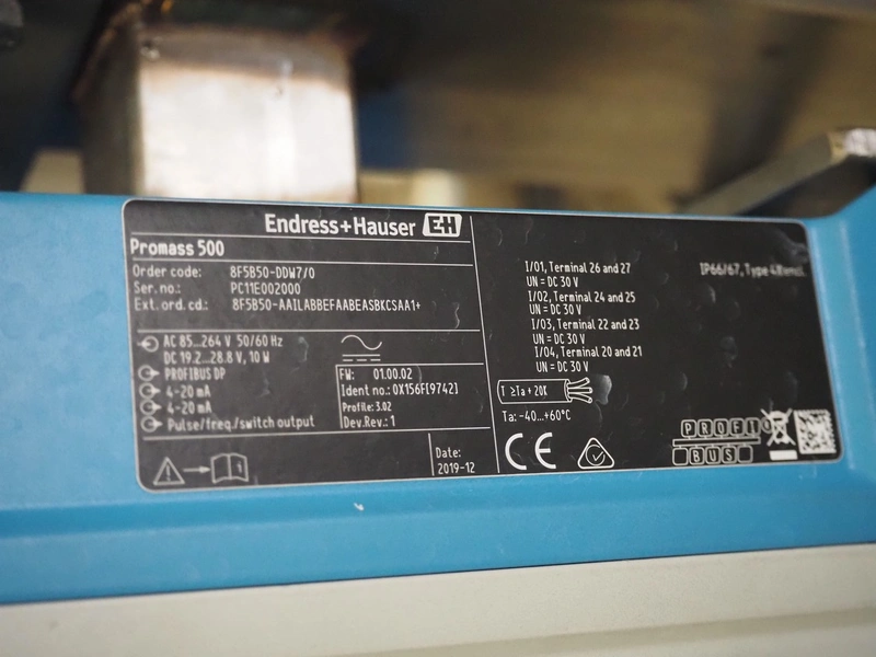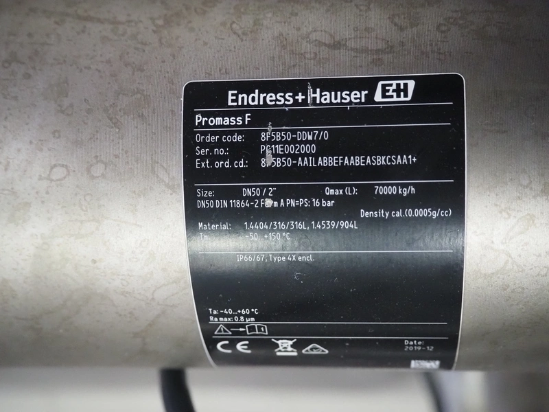 Endress+Hauser mass flow meter with transmitter, type: Promass F, serial number: P011E002000, DN50, dimensions: 730 mm x 130 mm x 330 mm, 90 mm x 170 mm x 200 mm.
