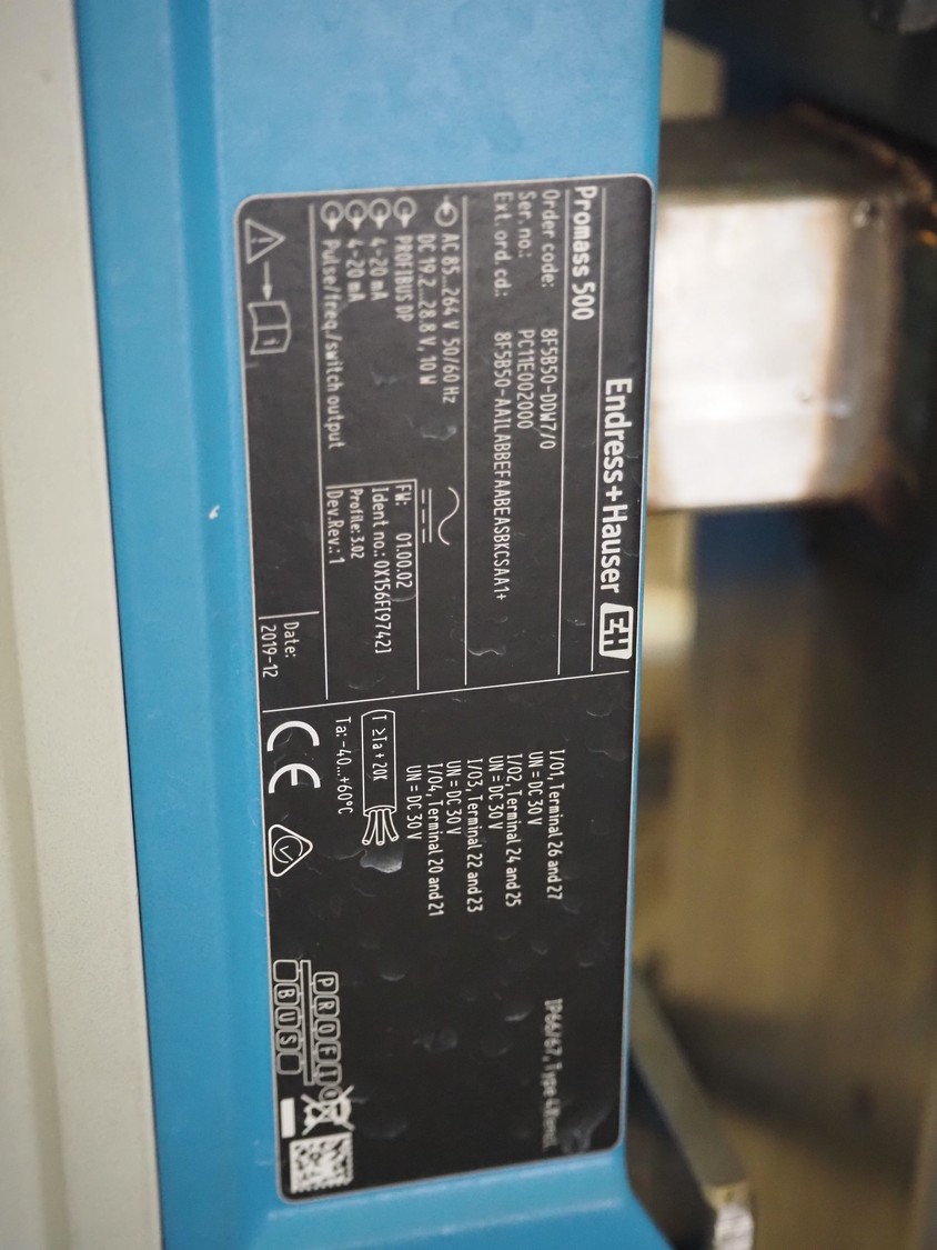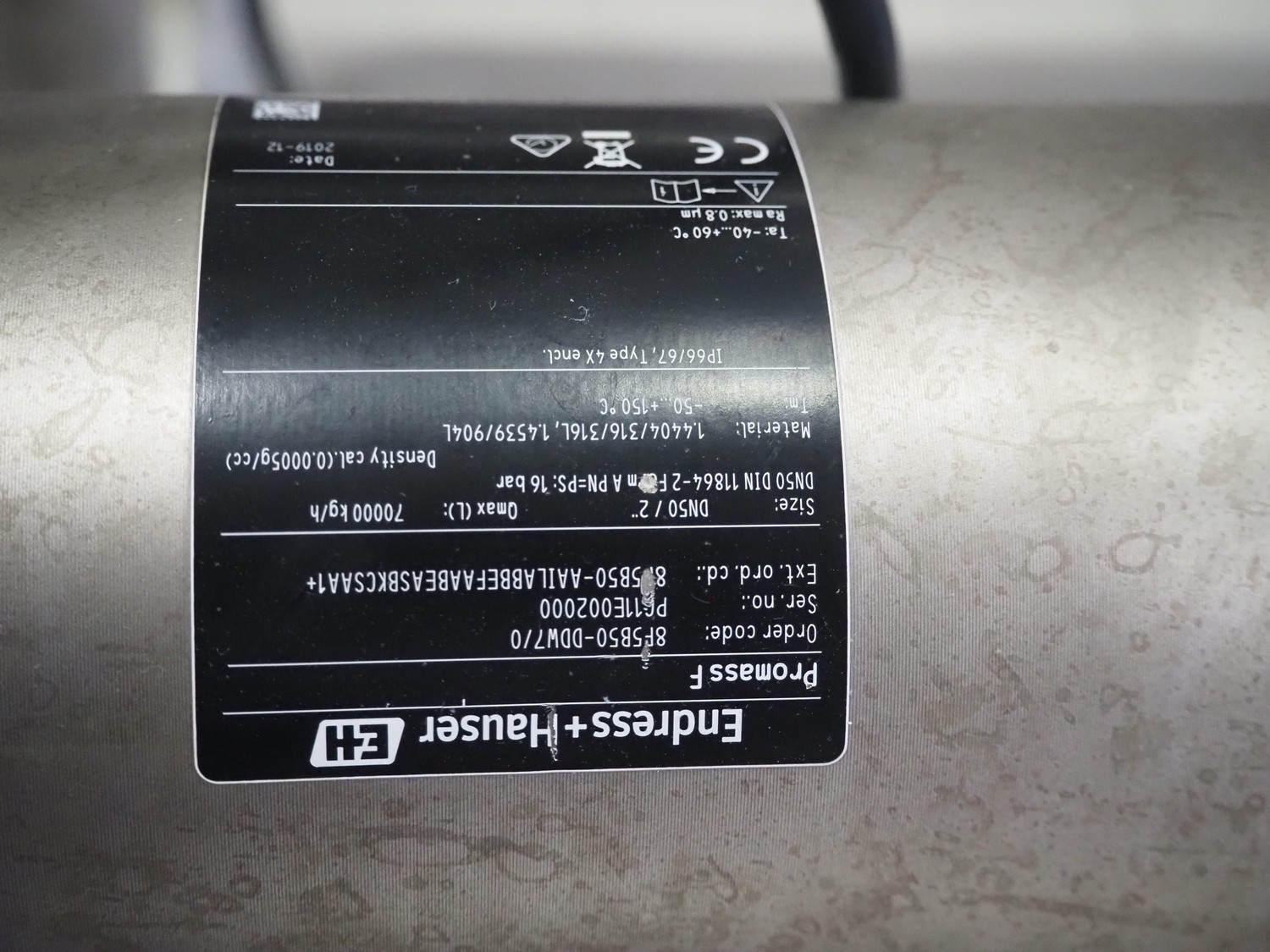 Endress+Hauser mass flow meter with transmitter, type: Promass F, serial number: P011E002000, DN50, dimensions: 730 mm x 130 mm x 330 mm, 90 mm x 170 mm x 200 mm.