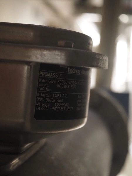 Endress+Hauser mass flowmeter, type: PROMASS F, serial number: 6C046D02000, DN80, dimensions: 200 mm x 850 mm x 350 mm.