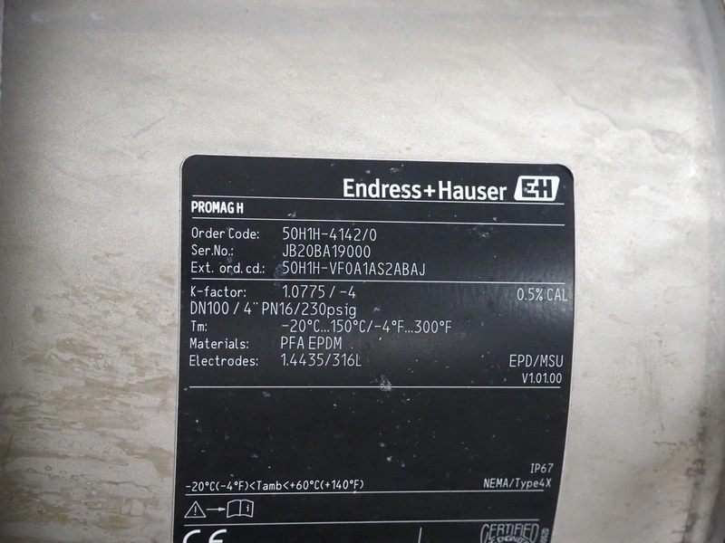 Endress+Hauser flowmeter, type: PROMAG H, serial number: JB20BA19000, DN100, dimensions: 250 mm x 150 mm x 170 mm.