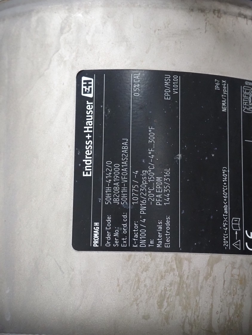 Endress+Hauser flowmeter, type: PROMAG H, serial number: JB20BA19000, DN100, dimensions: 250 mm x 150 mm x 170 mm.