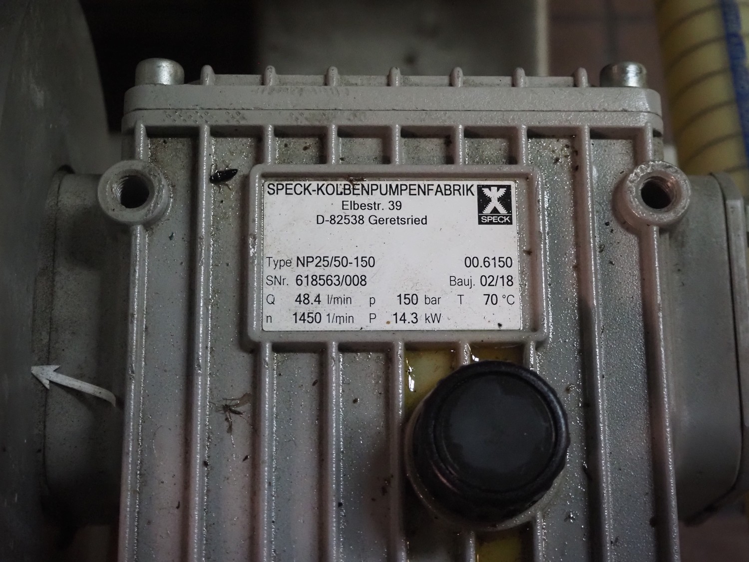 Speck high pressure plunger pump, type: NP25/50-150, serial number: 618563/008, year of construction: 02/18, capacity: 48.4 litre per minute, dimensions: 1200 mm x 700 mm x 1100 mm.