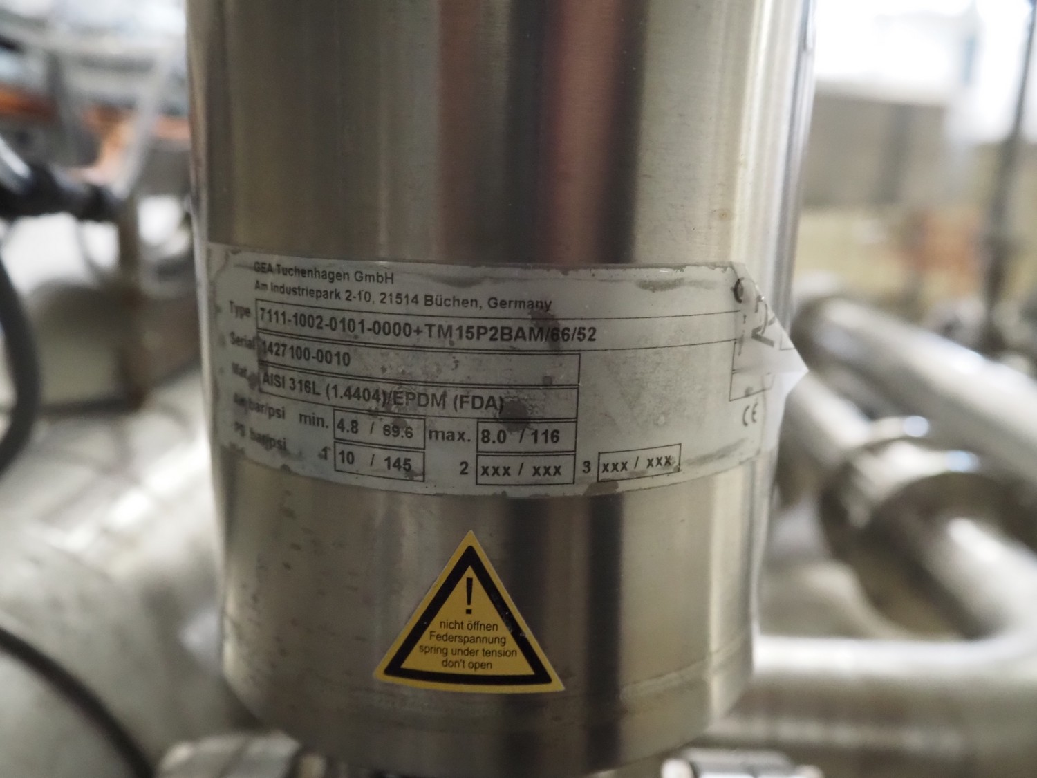 8 valves, brands: (6x) GEA Tuchenhagen GmbH, (2x) AWH, dimensions: (6x) ø 150 mm x 550 mm, (2x) 330 mm x 120 mm x 700 mm.