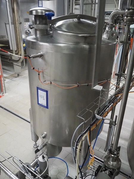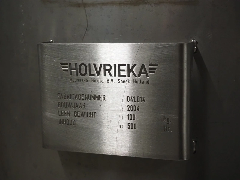 Holvrieka s/s tank, fabrication number: 041.014, year of construction: 2004, weight: 130 kg, volume: 500 litres, dimensions: 900 mm x 900 mm x 2100 mm.