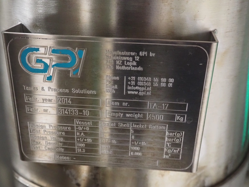 GPI s/s isolated ice water cooled tank, fabrication number: 314133-10, year of construction: 2014, weight: 4500 kg, volume: 51.3 m³, dimensions: ø 3900 mm x 5750 mm.