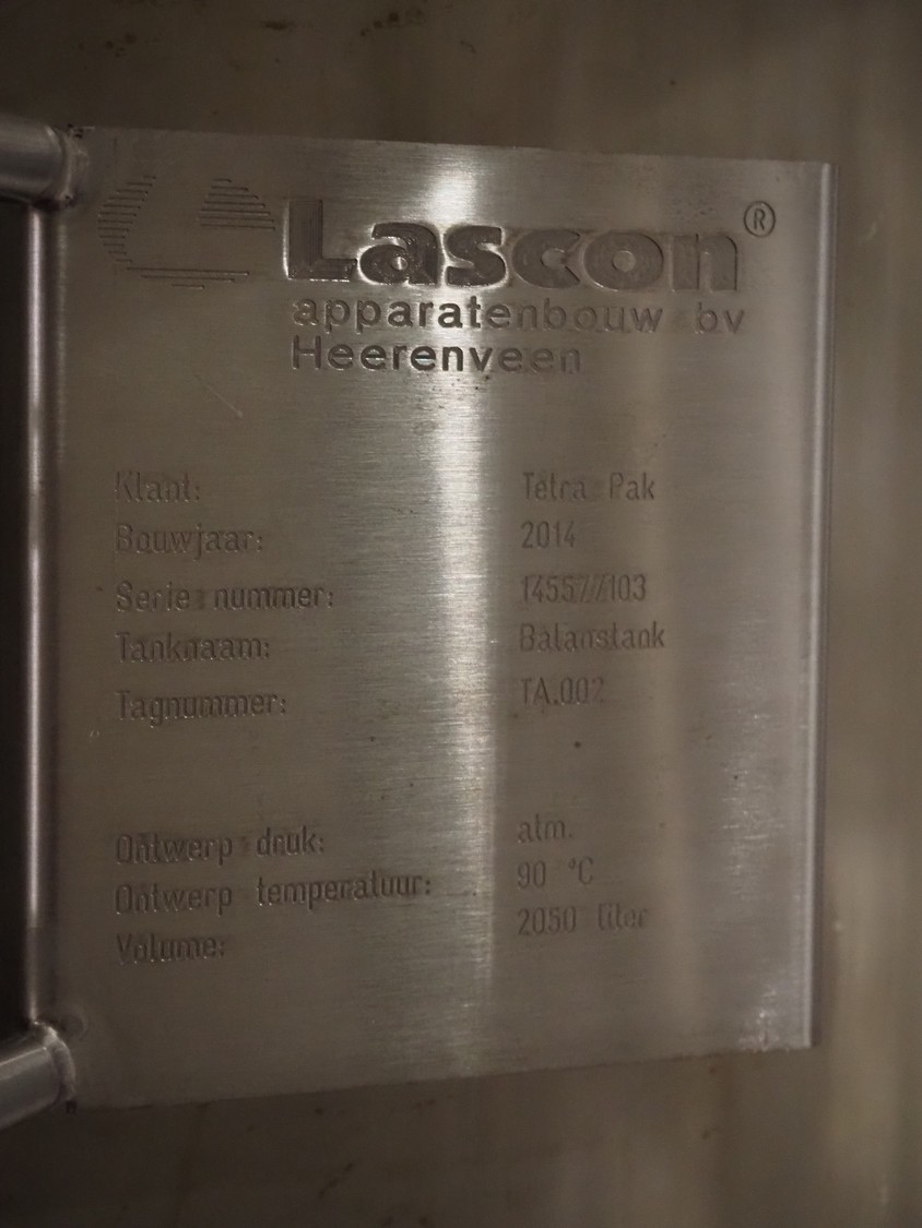 Lascon s/s balance tank, serial number: 14557/103, year of construction: 2014, volume: 2050 litres, dimensions: 1500 mm x 1500 mm x 2600 mm.