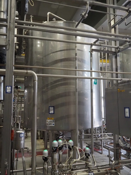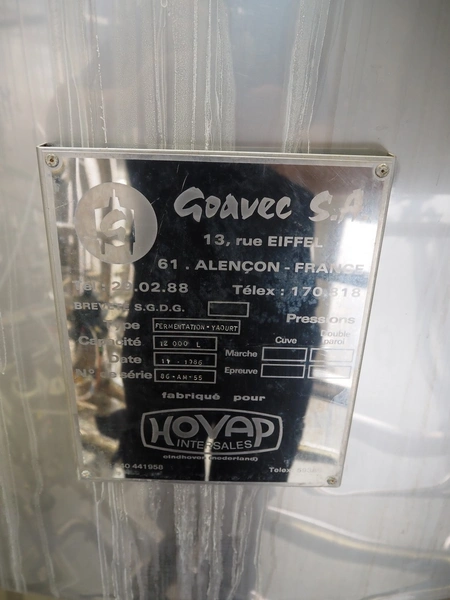 Goavec S.A. s/s isolated tank used for whey cream and bactofugate, type: FERMENTATION-YAOURT, serial number: 86-AM-55, year of construction: 1986, volume: 12000 litres, dimensions: ø 2600 mm x 5250 mm.