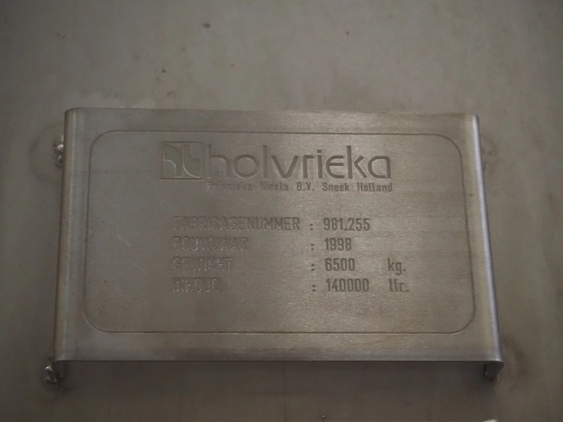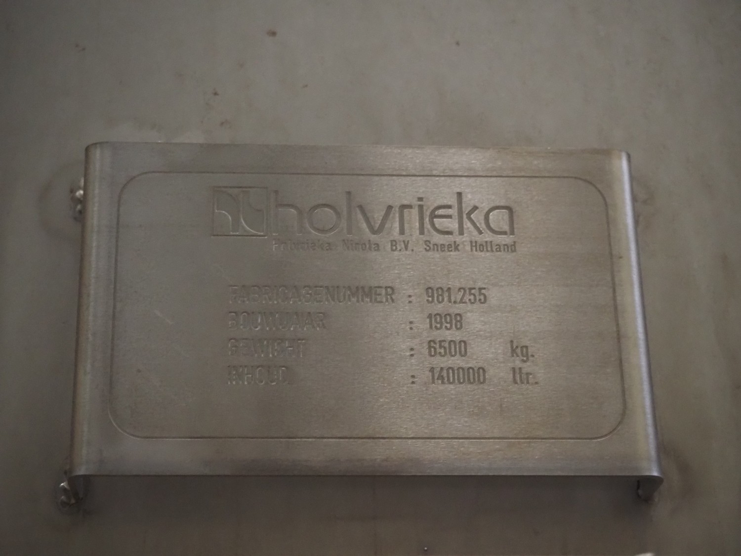 Holvrieka s/s tank used for warm condensate, fabrication number: 981.255, year of construction: 1998, weight: 6500 kg, volume: 140000 litres, dimensions: 3450 mm x 20060 mm.