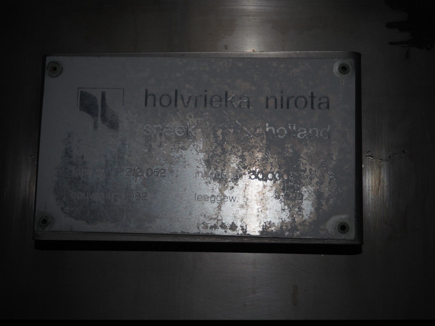 Holvrieka s/s isolated tank, fabrication number: 212.052, year of construction: 1982, volume: 30000 litres, inside dimensions: ø 2750 mm x 10800 mm, Jongia agitator, type: JDRW-2/4B, total dimensions: ø 2800 mm x 11170 mm.