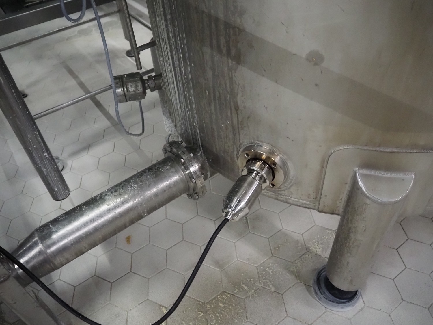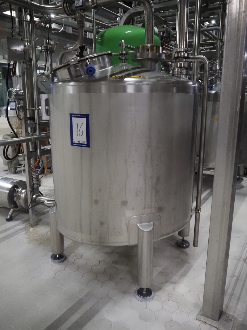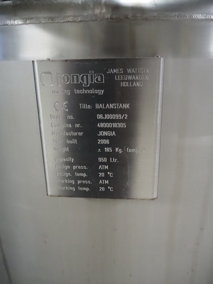 Jongia s/s balance tank with Endress+Hauser volume meter, year of construction: 2006, weight: 185 kg, volume: 950 litres, dimensions: ø 1100 mm x 1700 mm.
