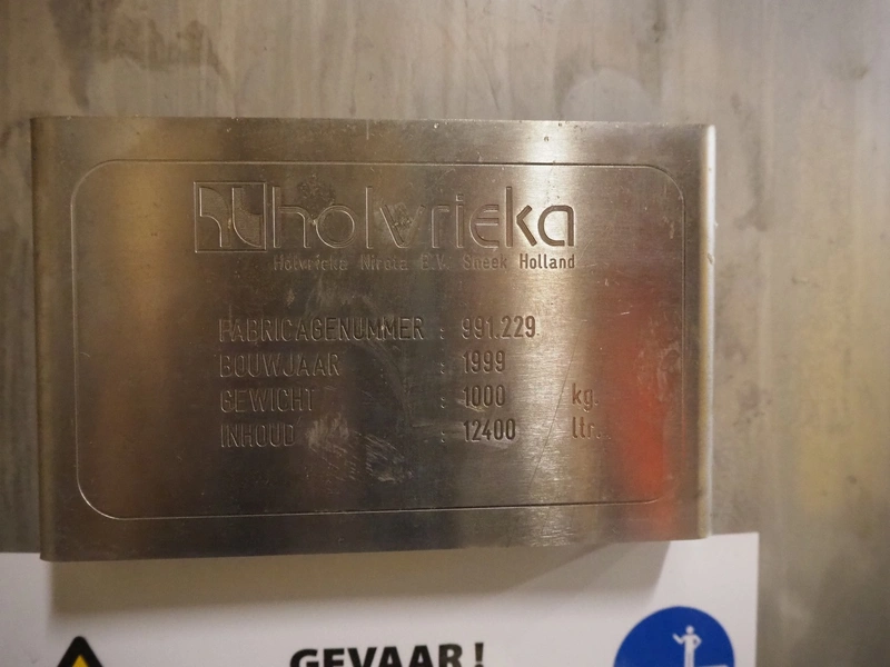 Holvrieka s/s tank used for plastic coating, fabrication number: 991.229, year of construction: 1999, 1000 kg, volume: 12400 litre, dimensions: Ø 1950 mm x 4850 mm.