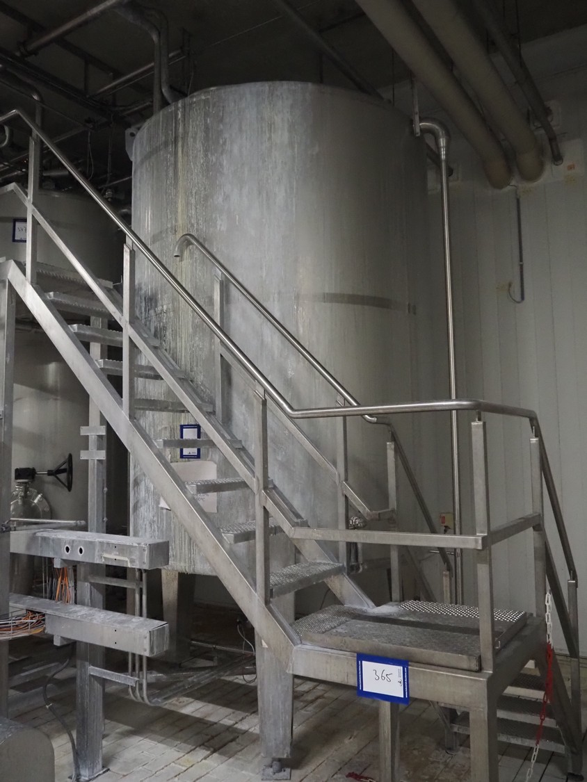 S/s CIP tank, volume: 10 m³, inside dimensions: ø 2150 mm x 3600 mm, total dimensions: ø 2200 mm x 4350 mm.