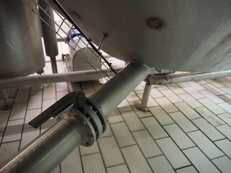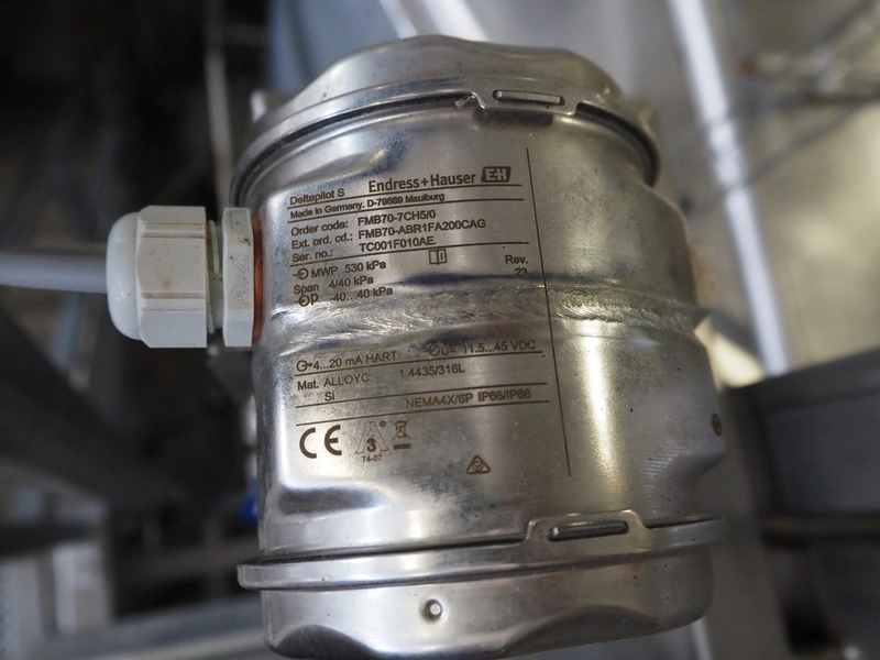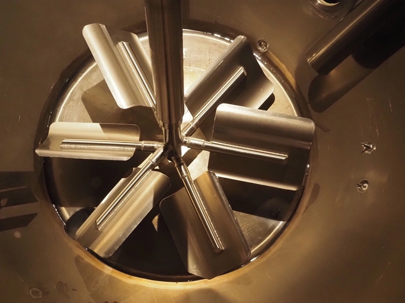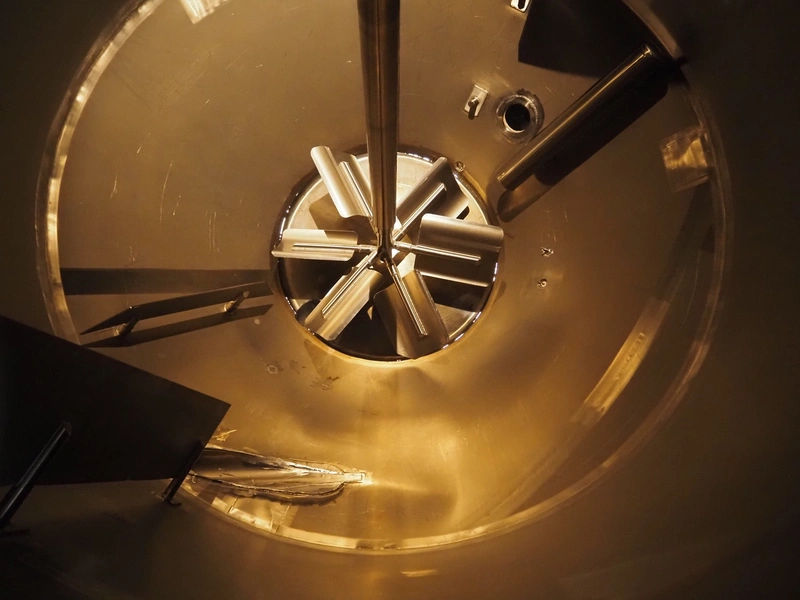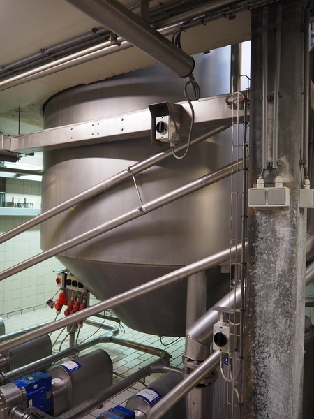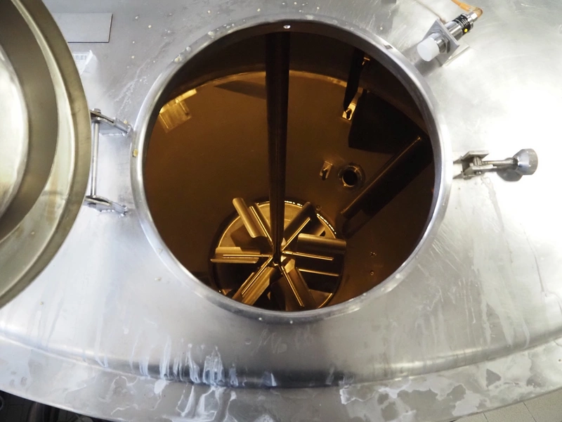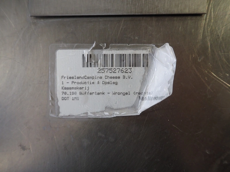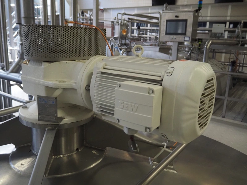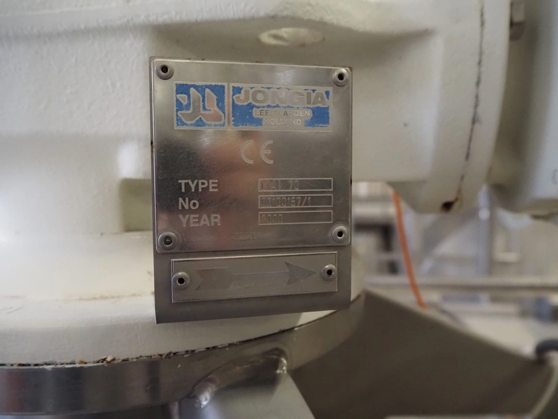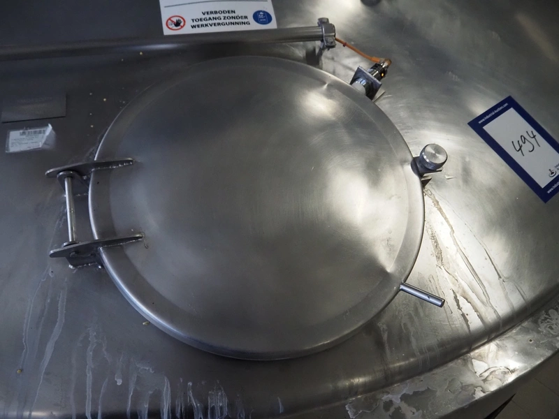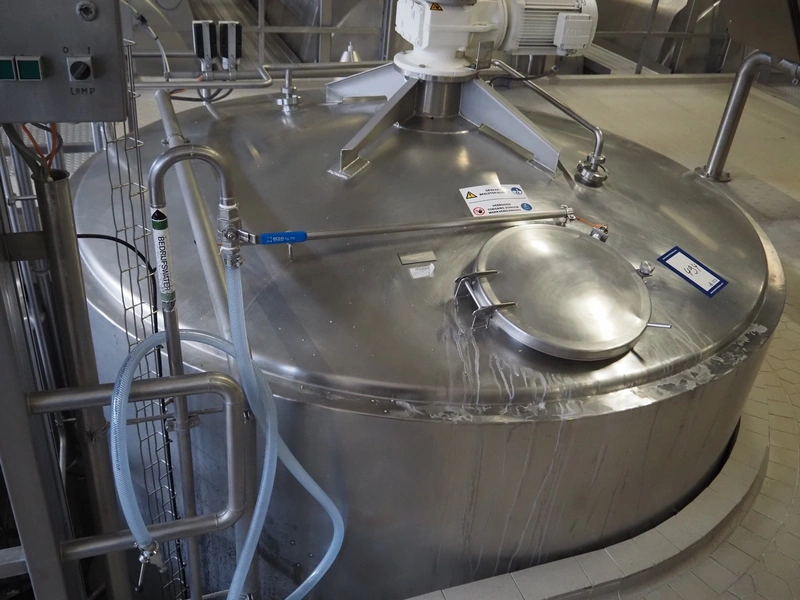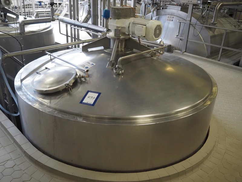 S/s double-jacketed cooled curd buffer tank with Jongia agitator, inside dimensions: ø 2450 mm x 2900 mm, type agitator: L(A) 70, total dimensions: ø 2800 mm x 4450 mm.