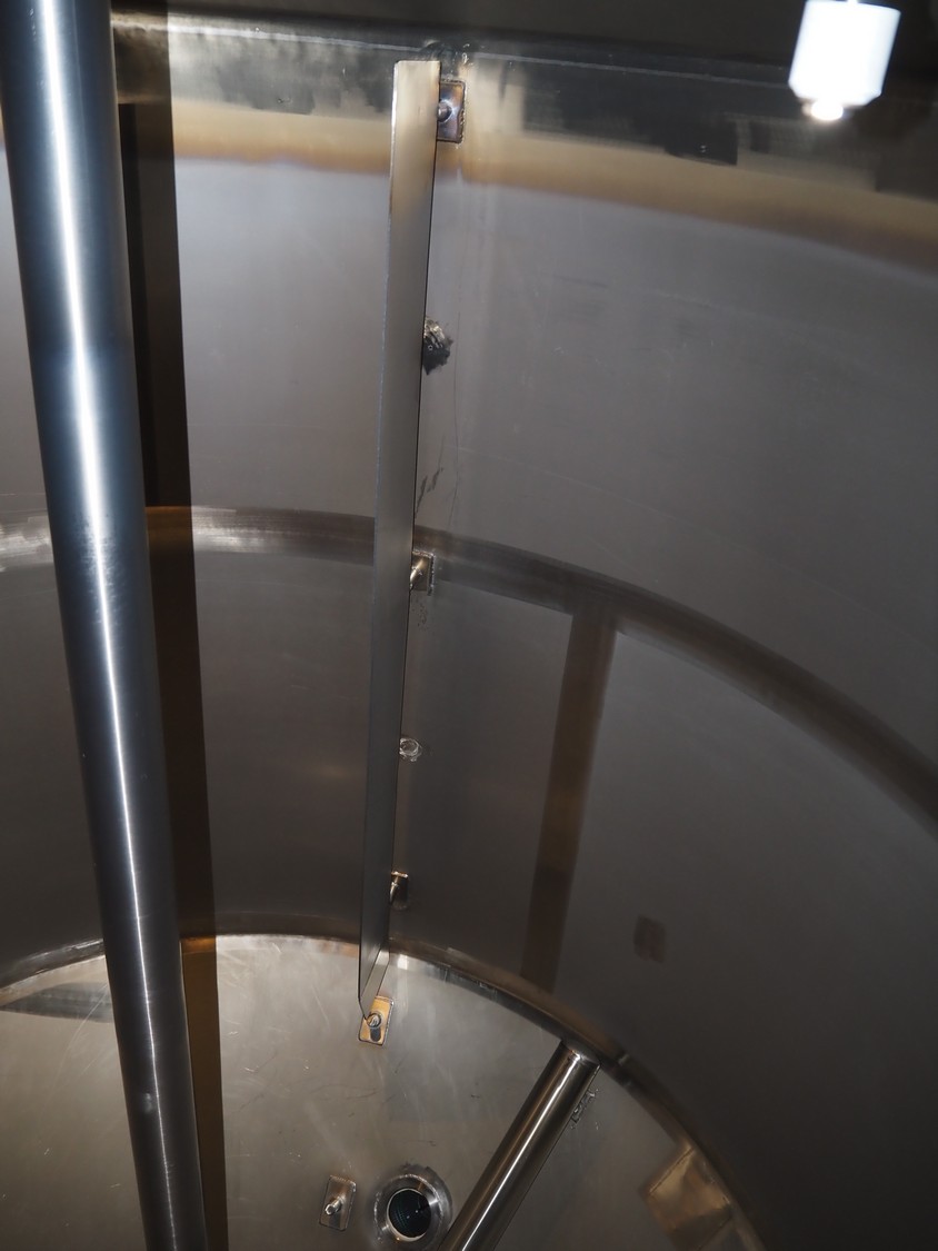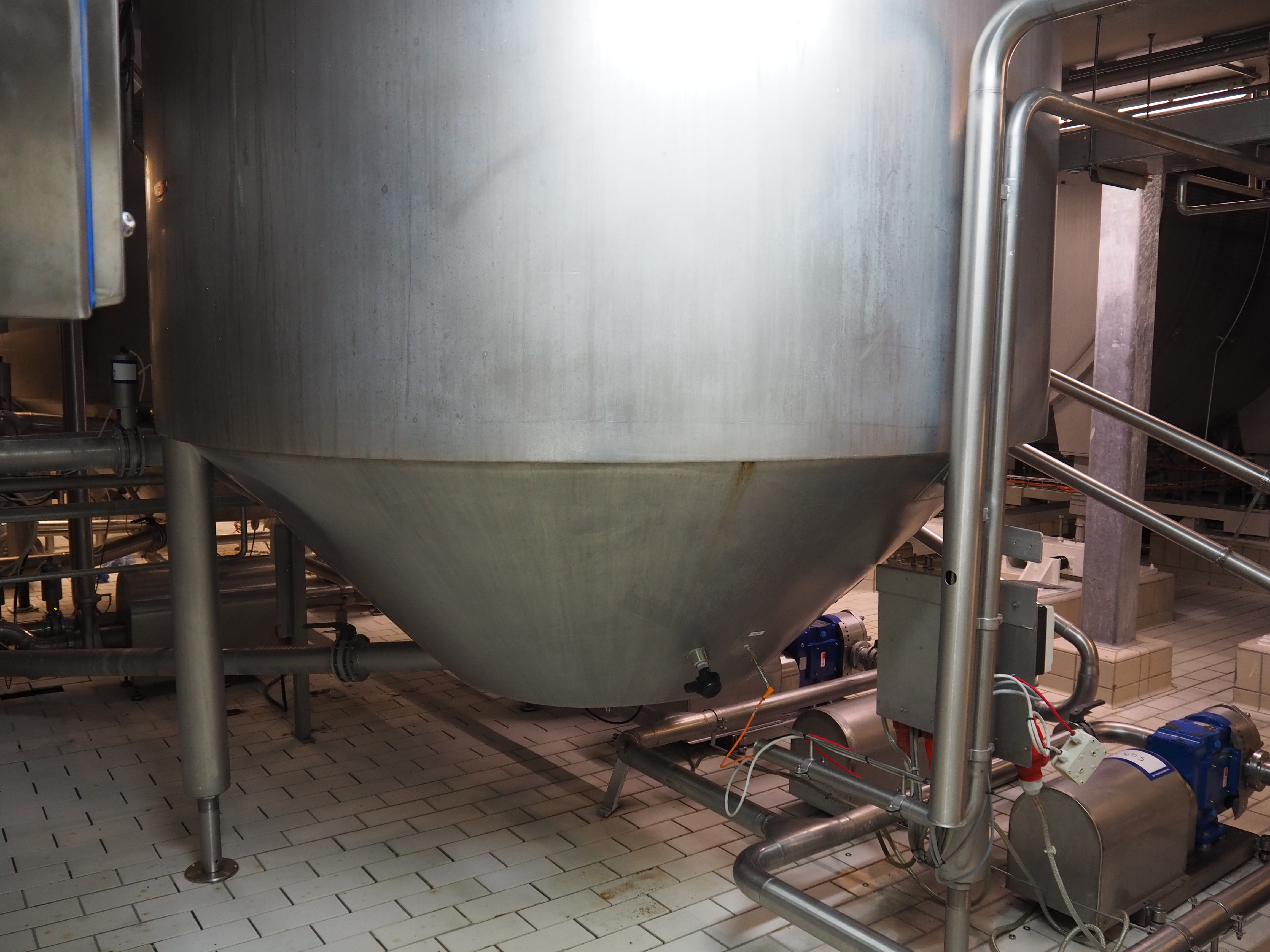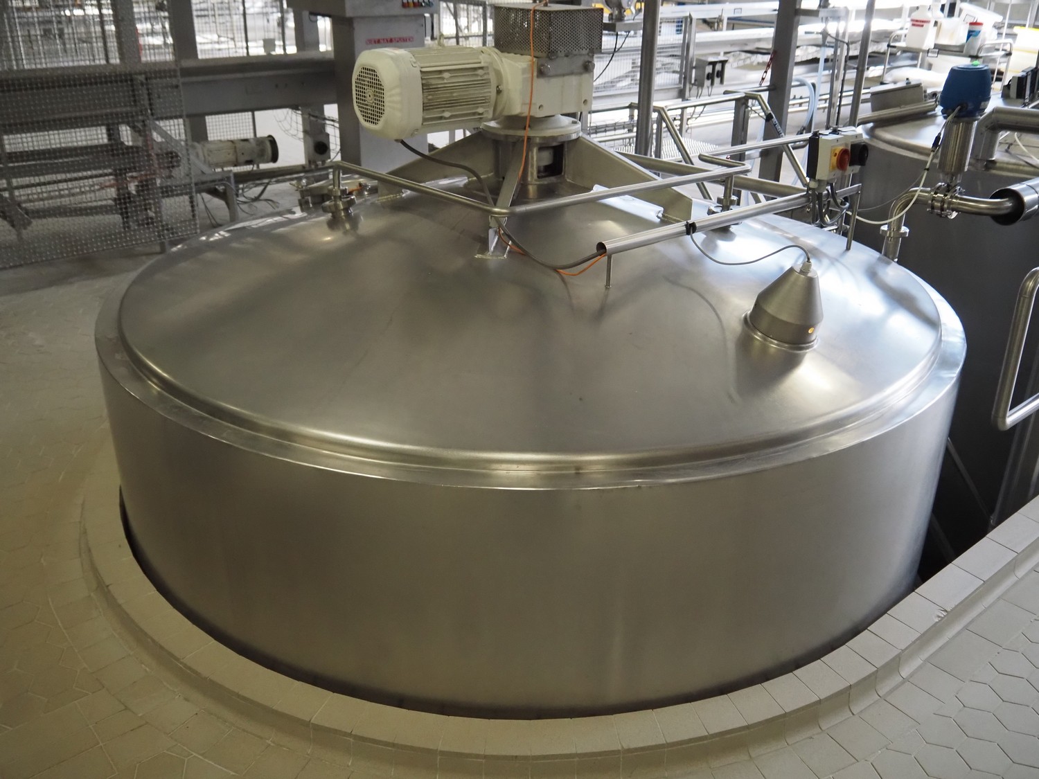 S/s double-jacketed cooled curd buffer tank with Jongia agitator, inside dimensions: ø 2450 mm x 2900 mm, type agitator: L(A) 70, total dimensions: ø 2800 mm x 4450 mm.