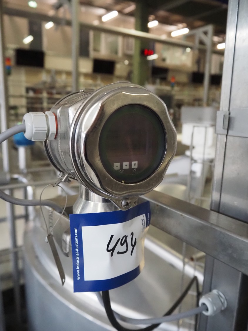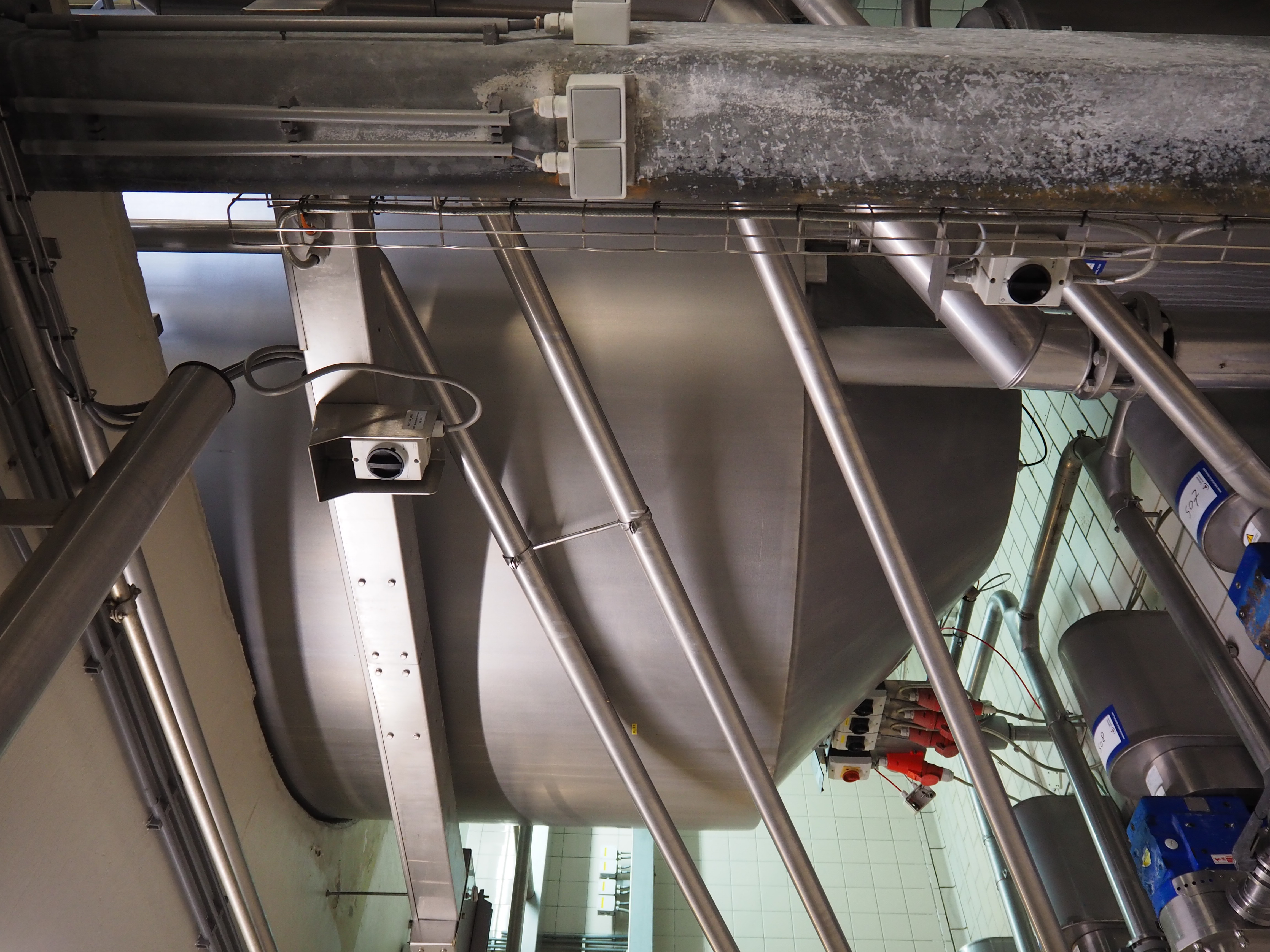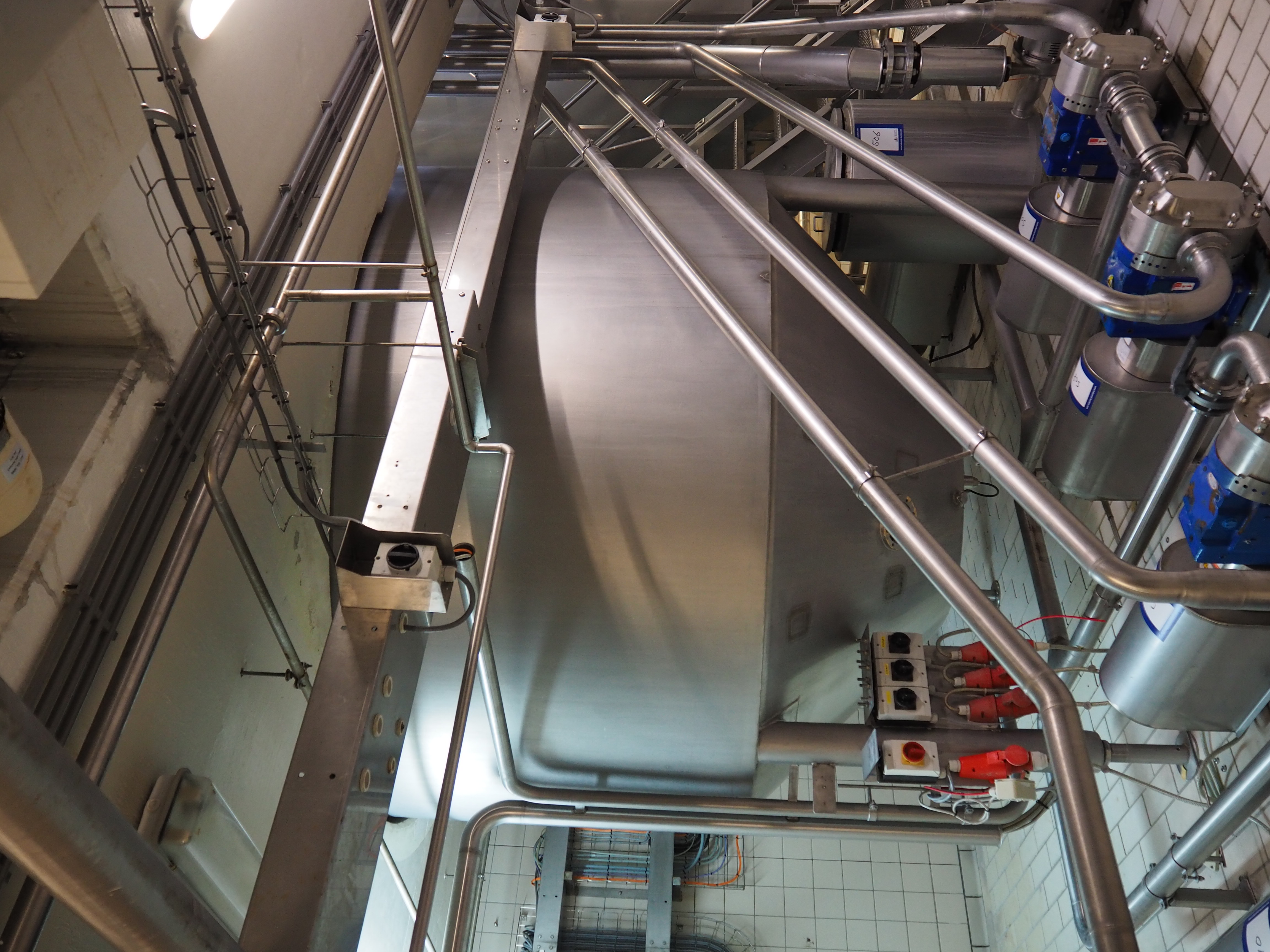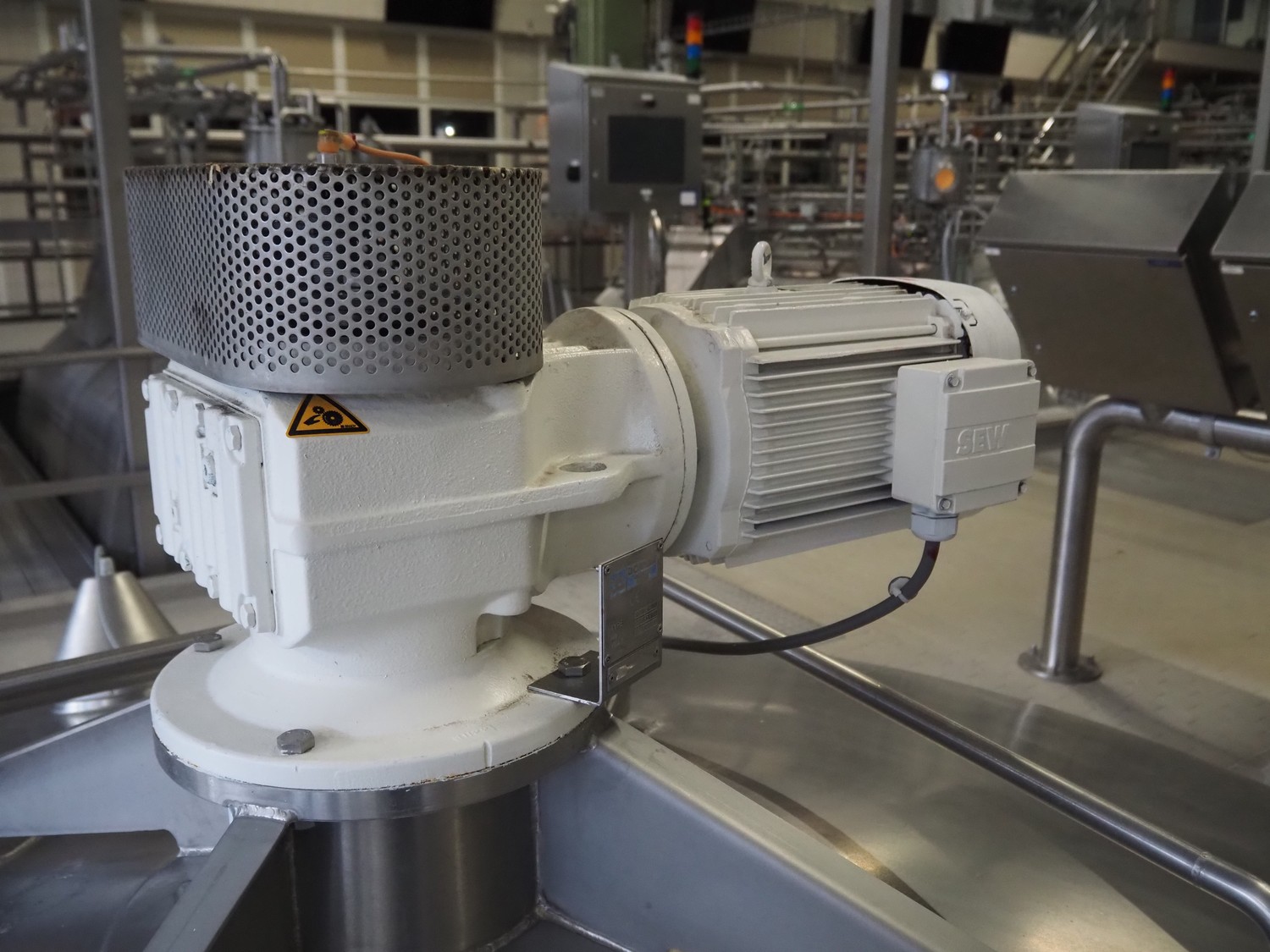 S/s double-jacketed cooled curd buffer tank with Jongia agitator, inside dimensions: ø 2450 mm x 2900 mm, type agitator: L(A) 70, total dimensions: ø 2800 mm x 4450 mm.