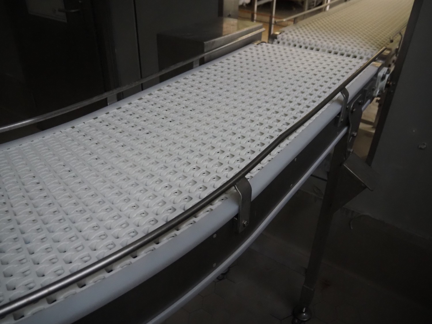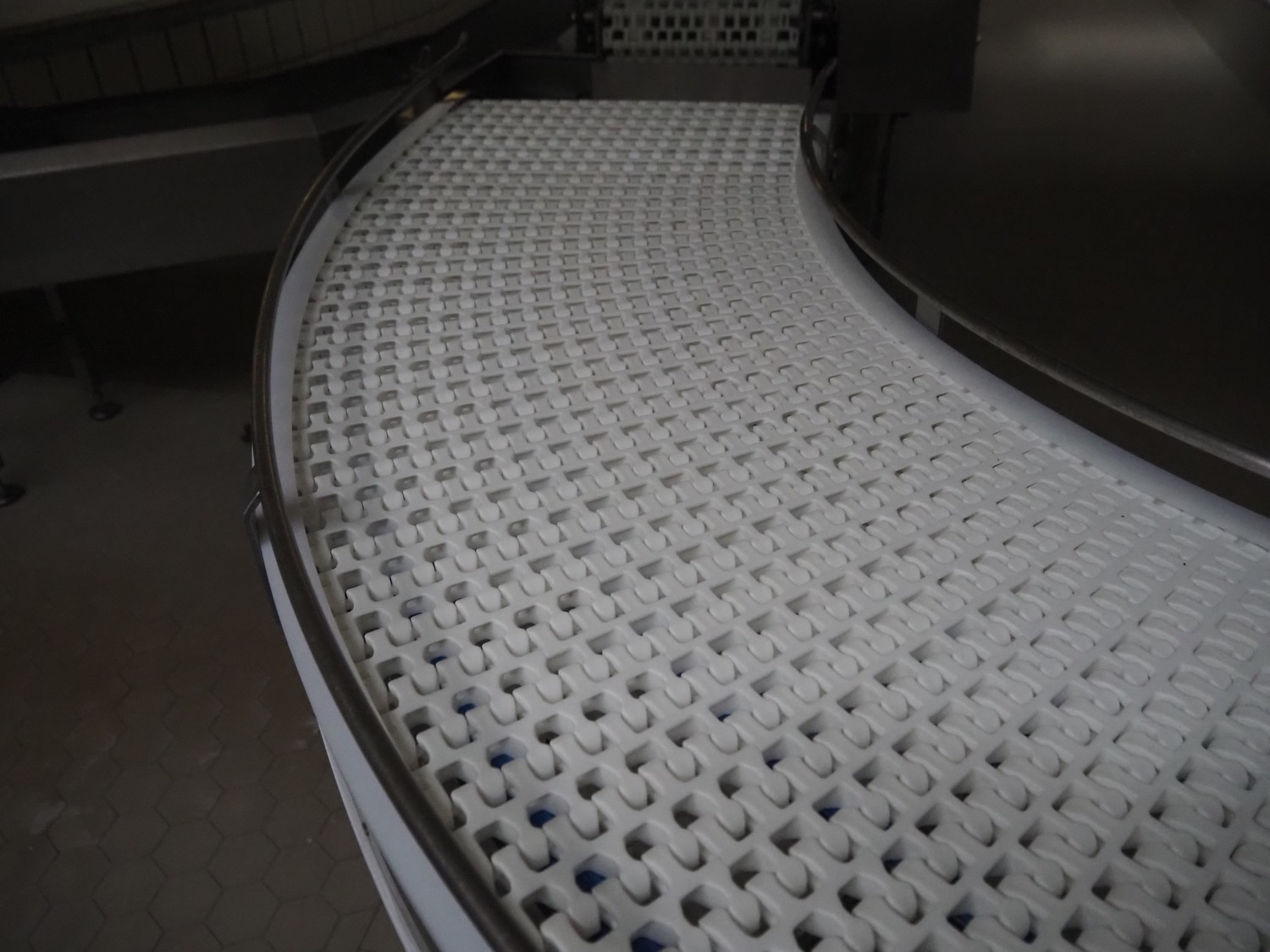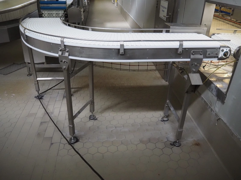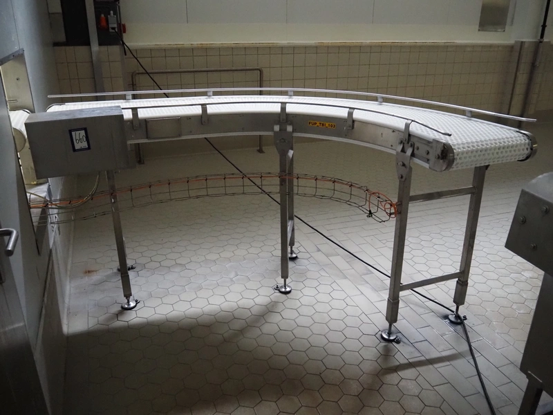 RoGroep 90° curve conveyor, type: 2, year of construction: 2010, plastic mesh belt, belt width: 420 mm, total dimensions: 1450 mm x 2050 mm x 1150 mm.