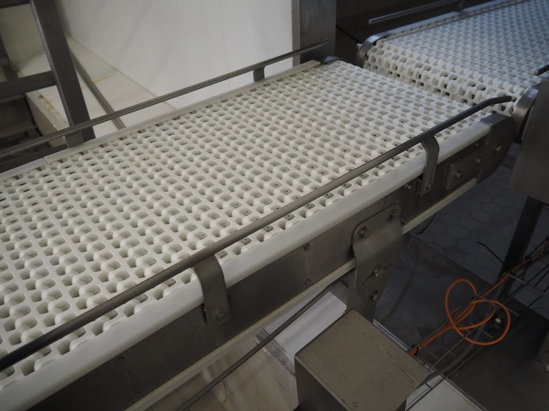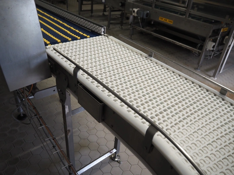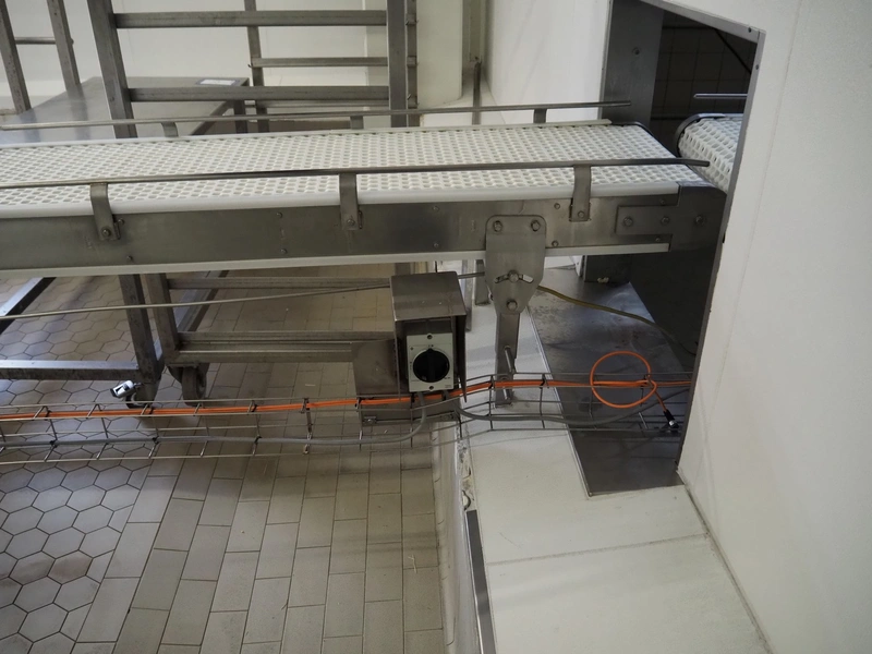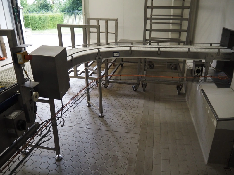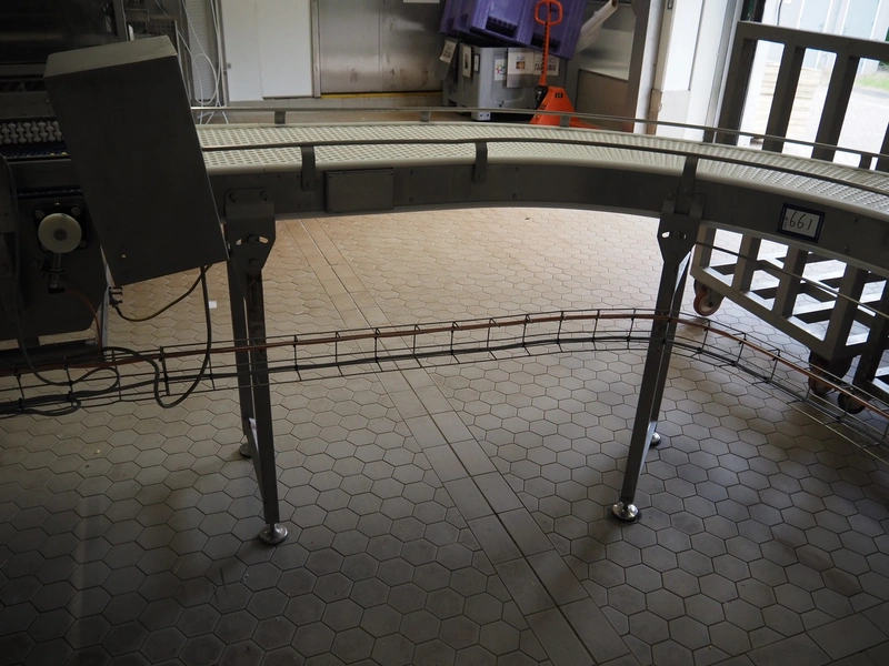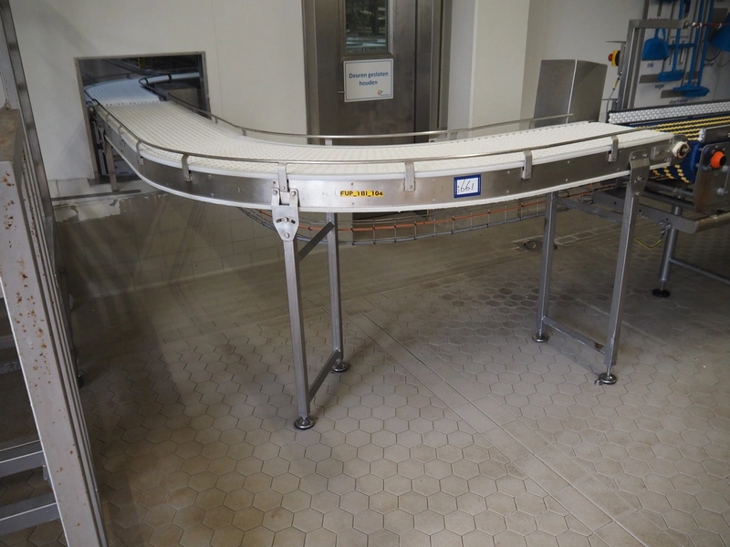 RO Groep curve conveyor with 90 ° curve, s/s frame, plastic mesh belt, year of construction: 2010, belt width: 450 mm, total dimensions: 2700 mm x 2200 mm x 1400 mm.