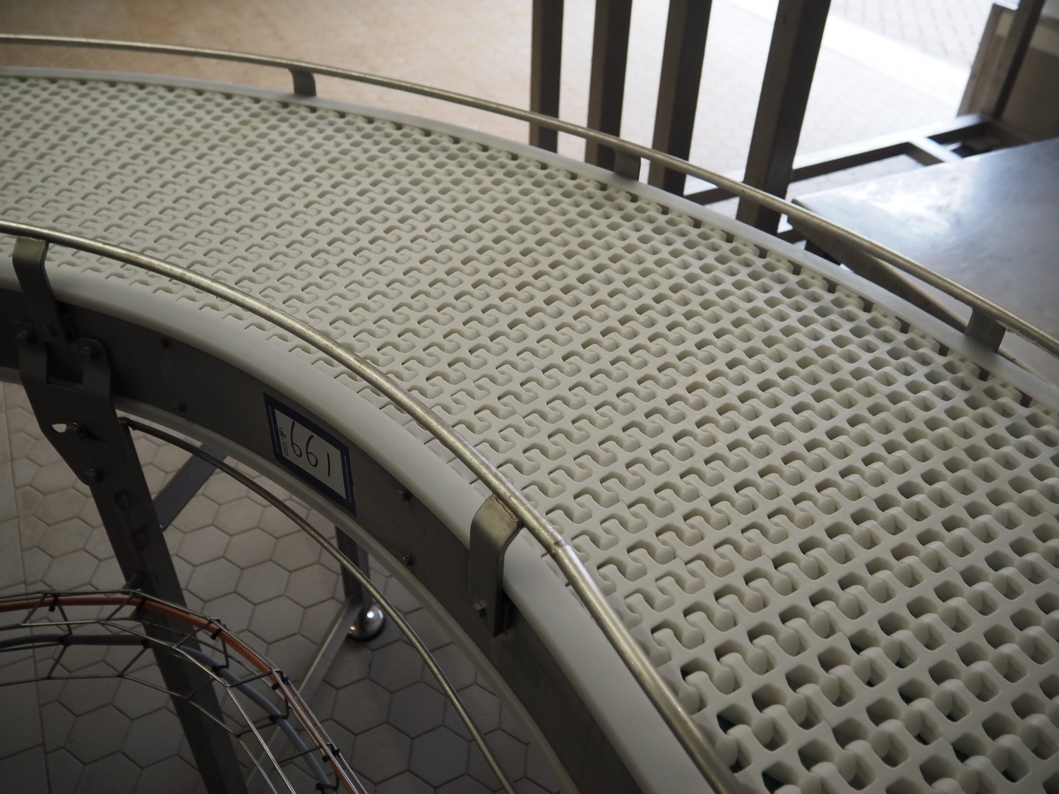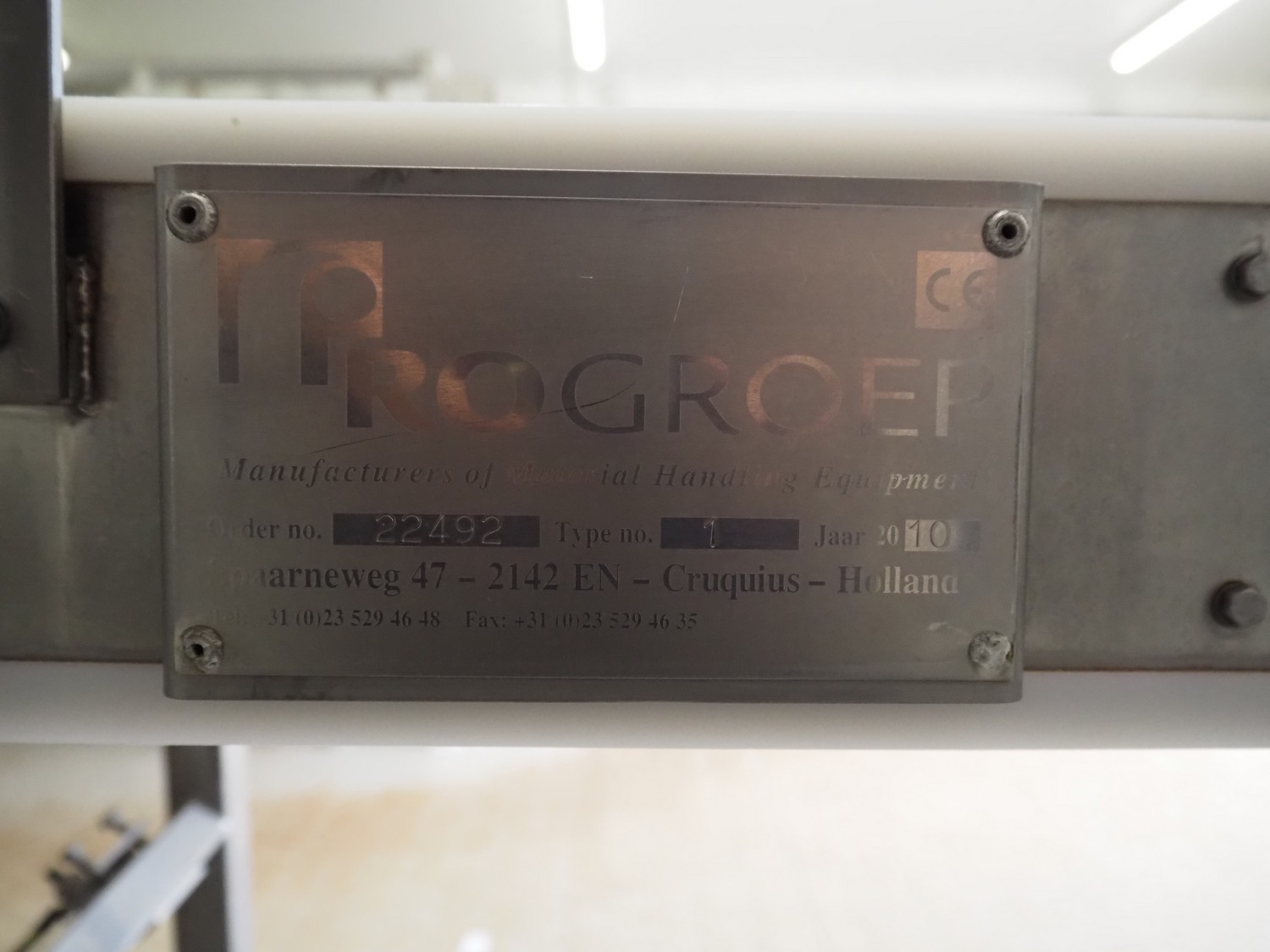 RO Groep curve conveyor with 90 ° curve, s/s frame, plastic mesh belt, year of construction: 2010, belt width: 450 mm, total dimensions: 2700 mm x 2200 mm x 1400 mm.
