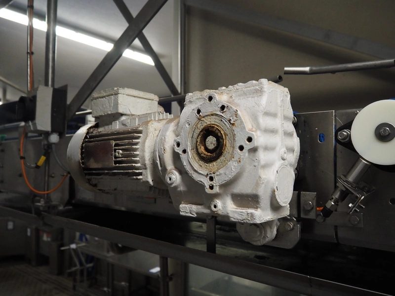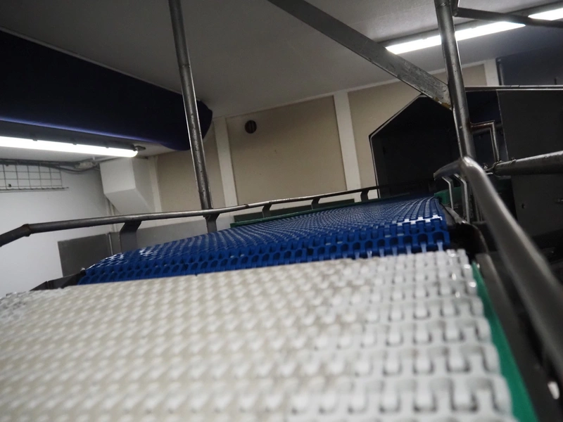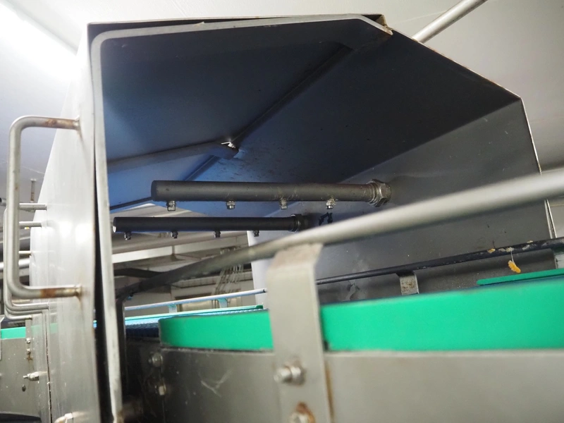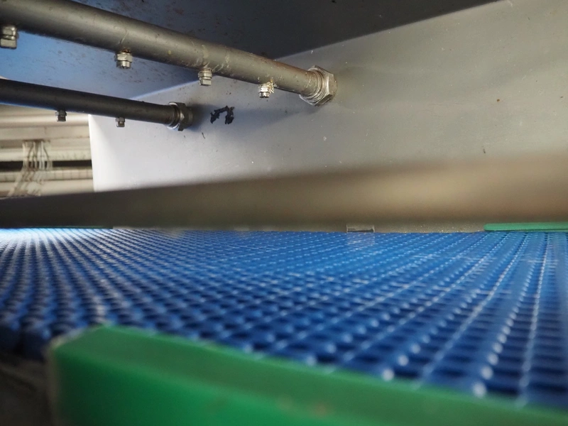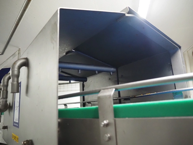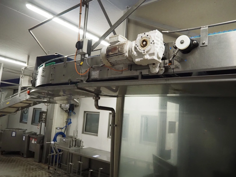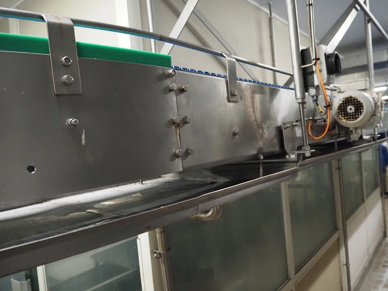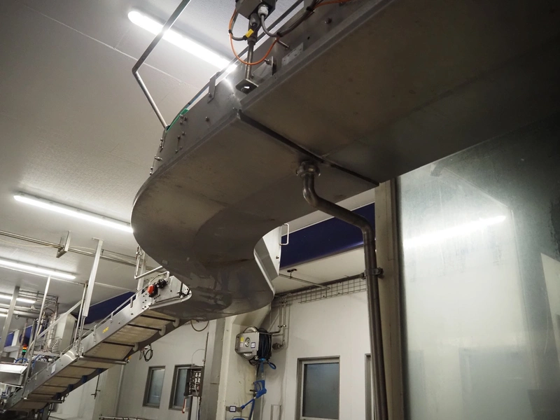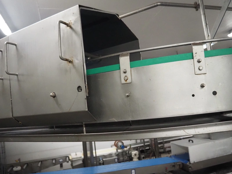 Van Meeuwen S-shaped curve conveyor with belt washing unit, s/s frame, plastic mesh belt, belt width: 455 mm, total dimensions: 9000 mm x 2000 mm x 400 mm.