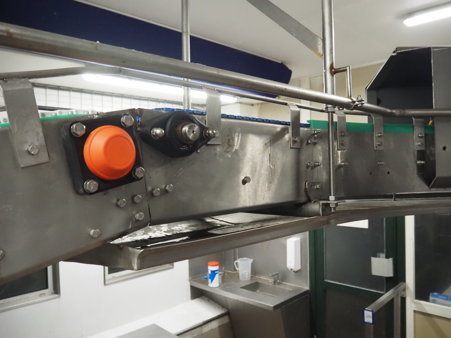 Van Meeuwen S-shaped curve conveyor with belt washing unit, s/s frame, plastic mesh belt, belt width: 455 mm, total dimensions: 9000 mm x 2000 mm x 400 mm.