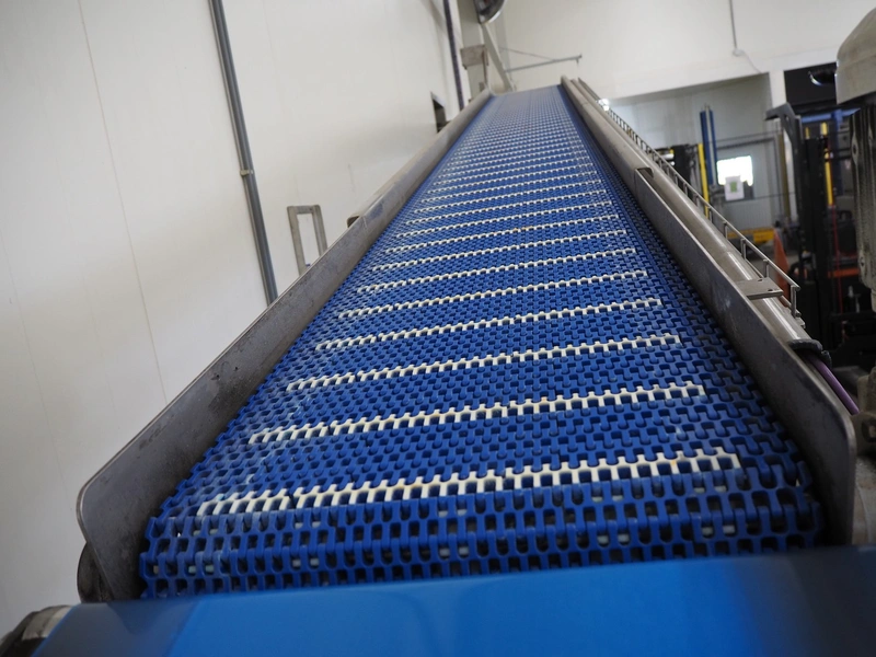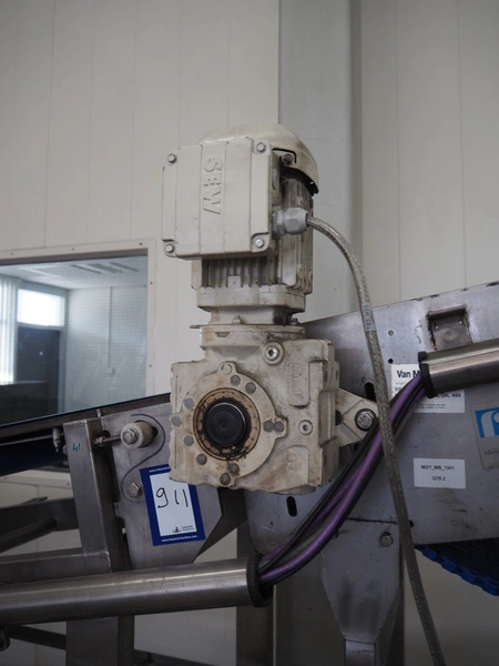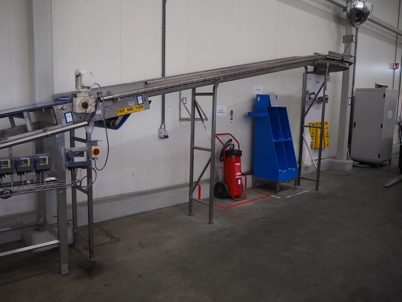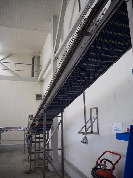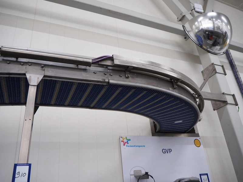 RO Group de-elevating 90° curve conveyor, s/s frame, plastic mesh belt, belt width: 450 mm, de-elevation: 2650 mm to 1750 mm, total dimensions: 6800 mm x 1400 mm x 2650 mm.