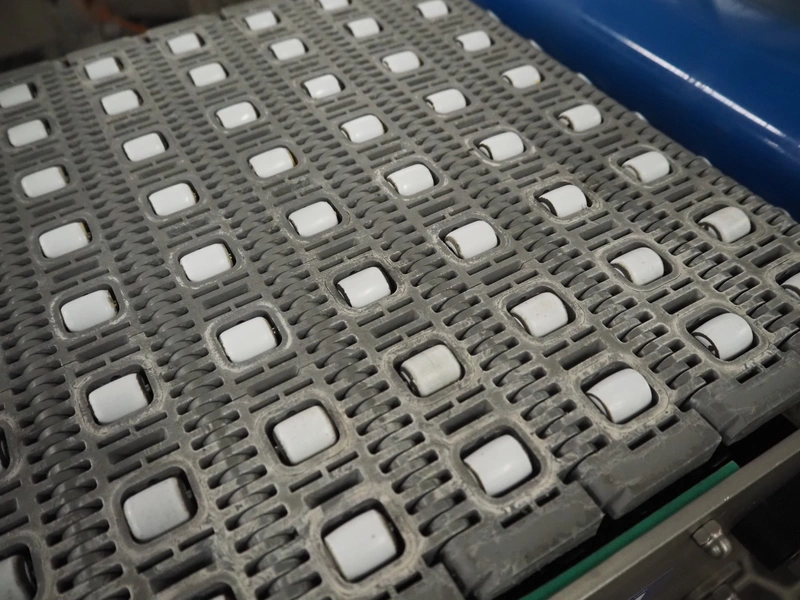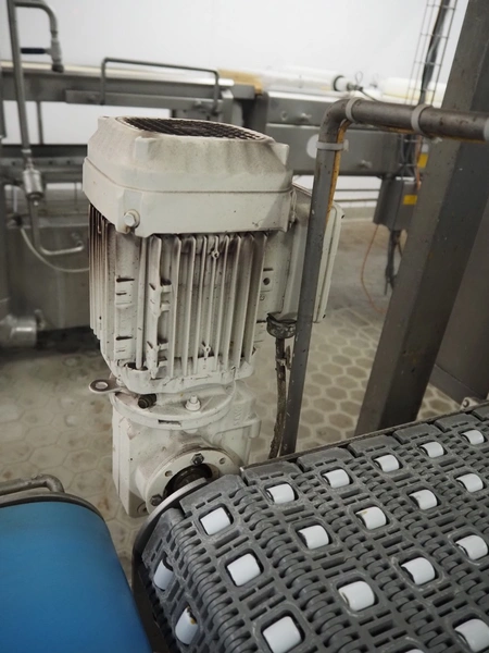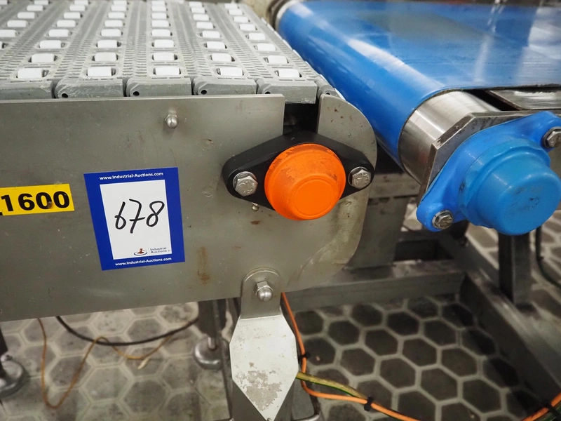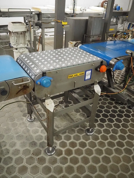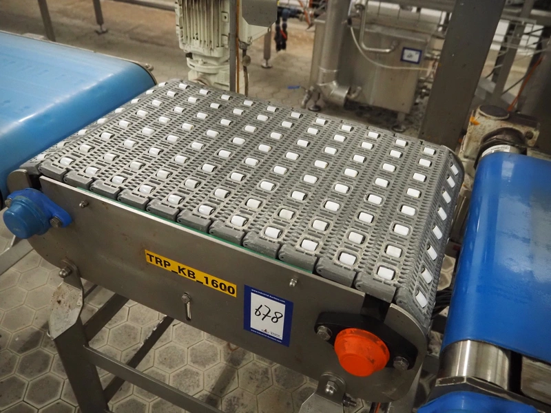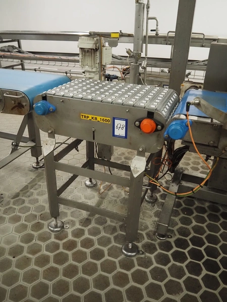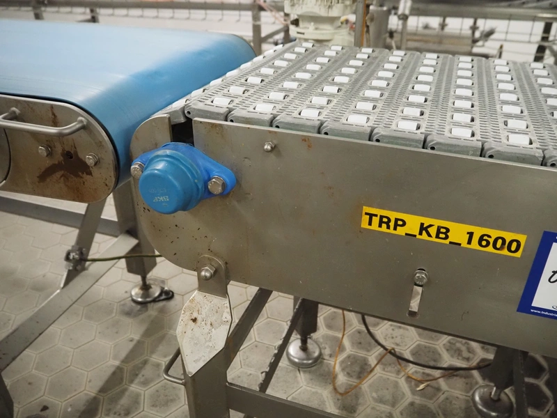 Transport belt with rollers, s/s frame, plastic mesh belt with rollers, belt width: 405 mm, total dimensions: 700 mm x 700 mm x 1100 mm.