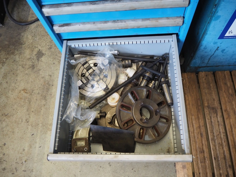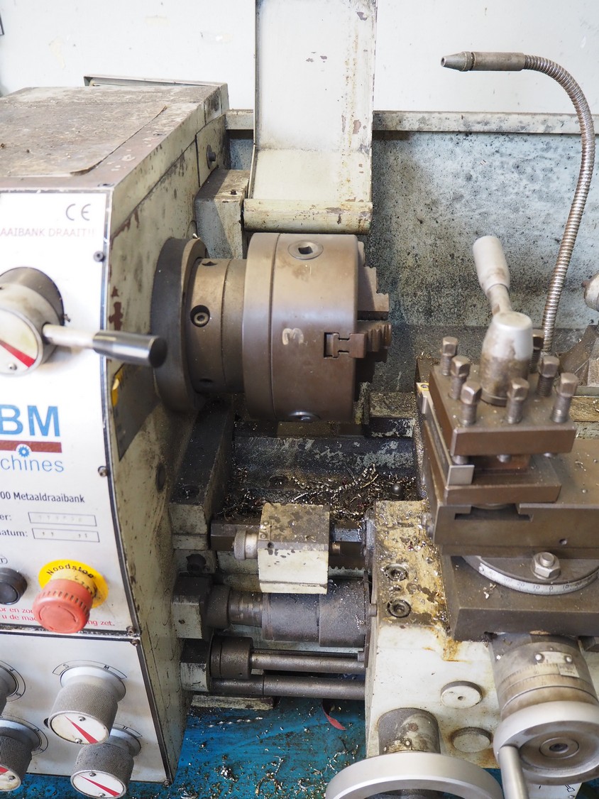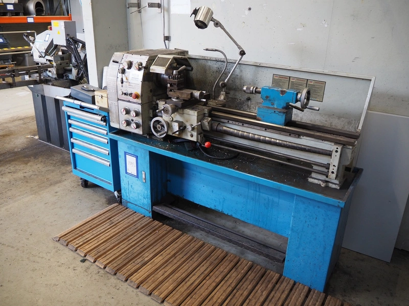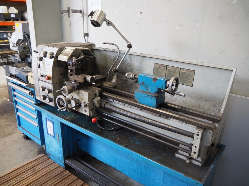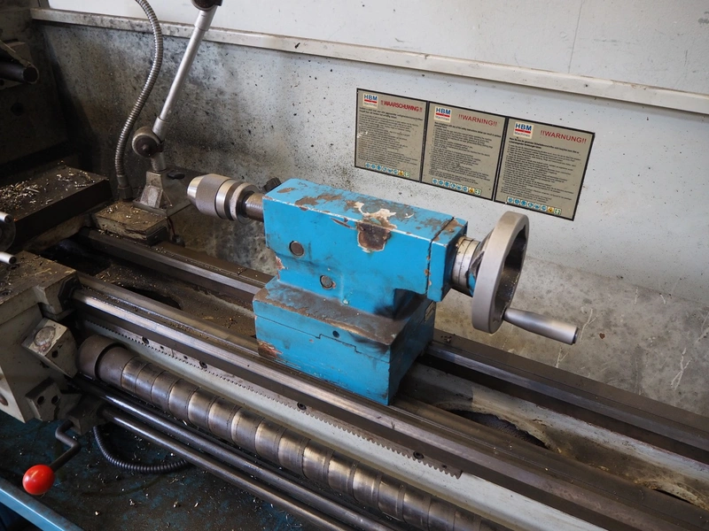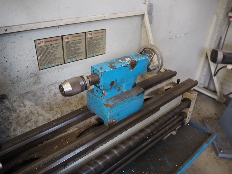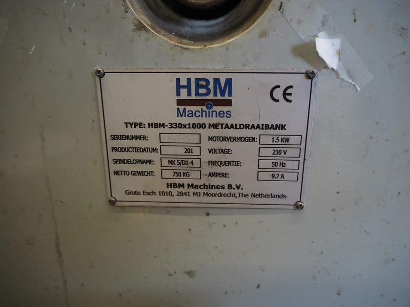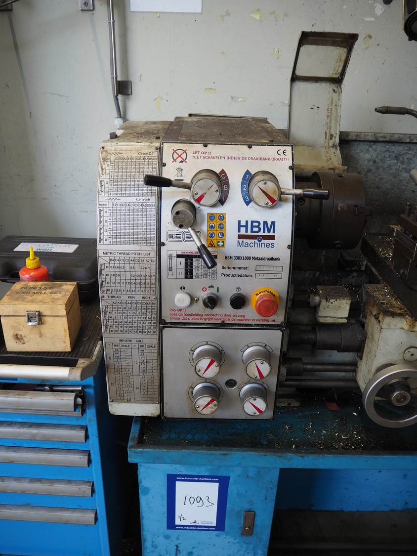 HBM Machines lathe, type: HBM-330x1000, serial number: 111538, 230 V, 50 Hz, 9.7 A, 1.5 kW, 750 kg, dimensions: 1750 mm x 700 mm x 1500 mm. Including tool trolley, dimensions: 650 mm x 570 mm x 900 mm.