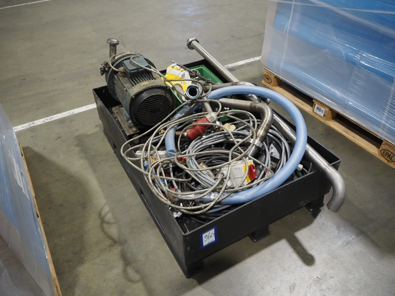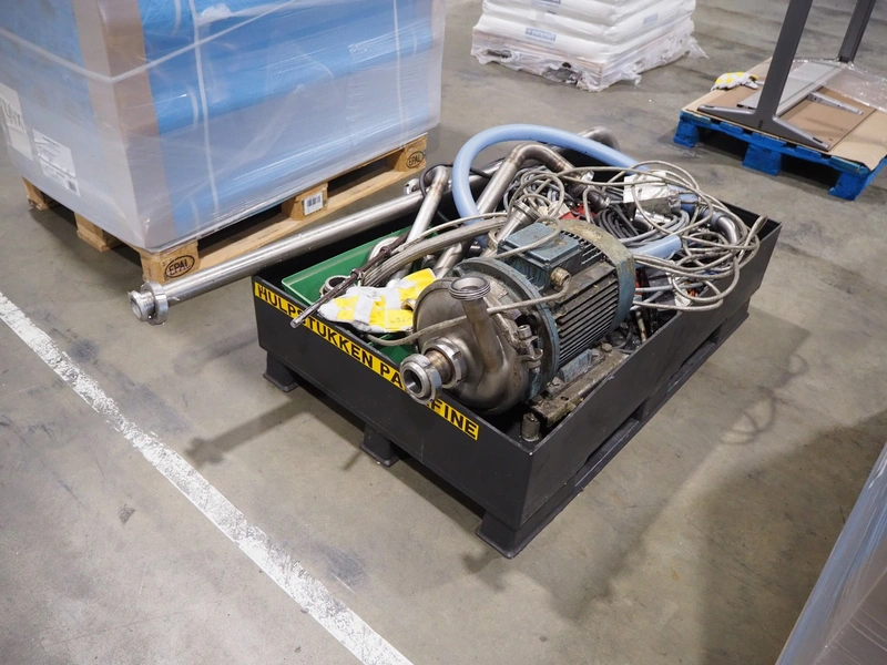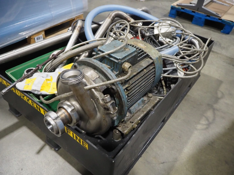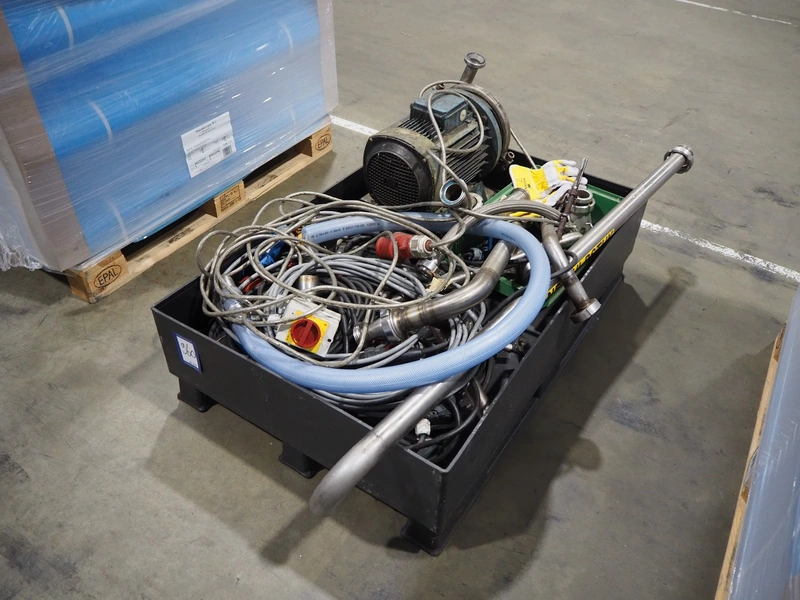 Pallet with large amount of parts, among others: pump, cables and piping's, dimensions: 1200 mm x 800 mm x 350 mm.