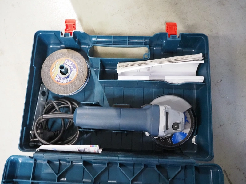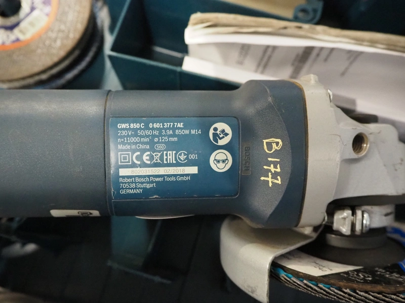 Case with Bosch angle grinder, model: GWS 850 C, serial number: 802031522, year of construction: 02/2018, 230 V, 50/60 Hz, 3.9 A, 850 W, dimensions: 440 mm x 320 mm x 120 mm.