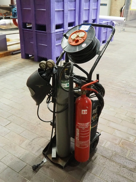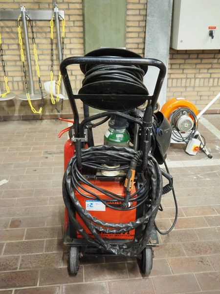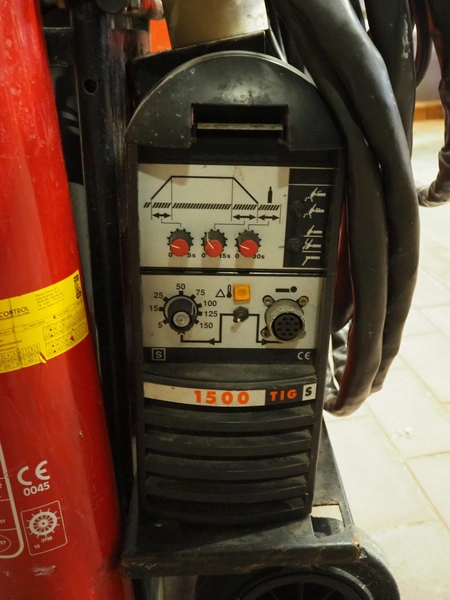 Kemppi welding machine on steel welding trolley, type: 1500 TIG S, dimensions: 600 mm x 500 mm x 1270 mm.