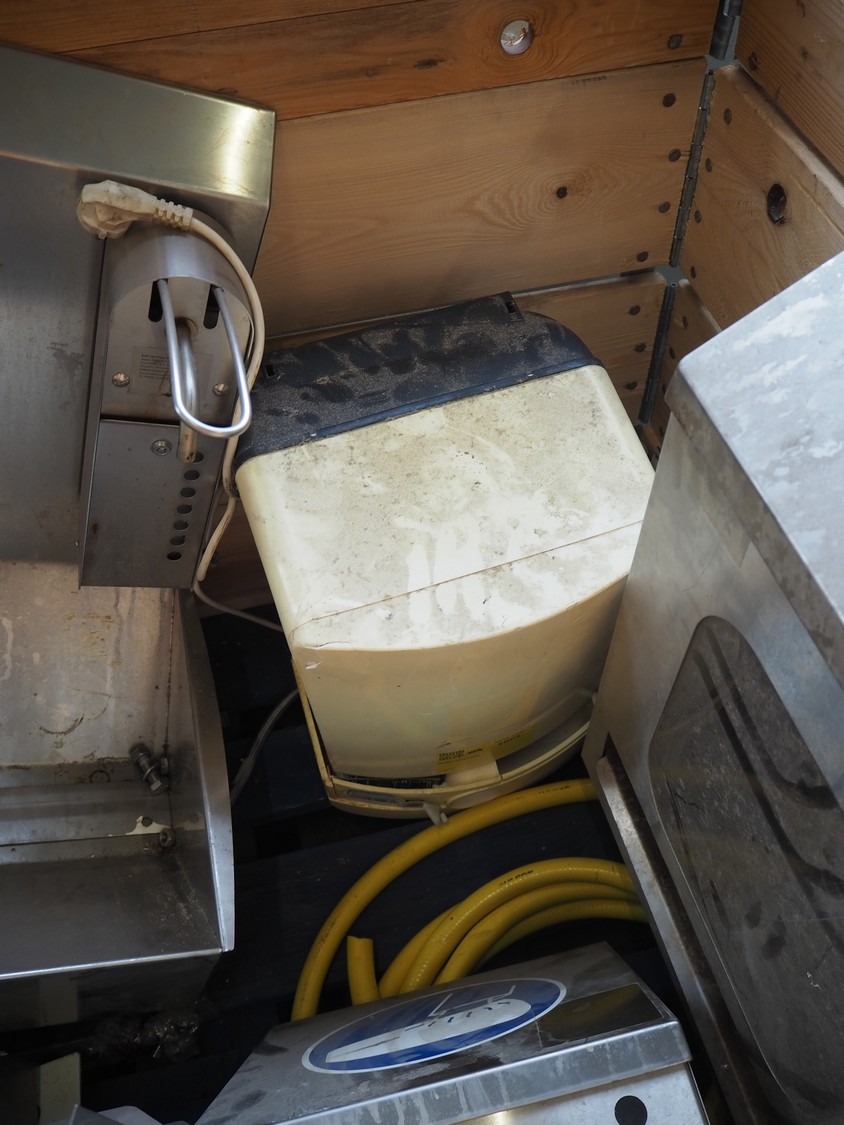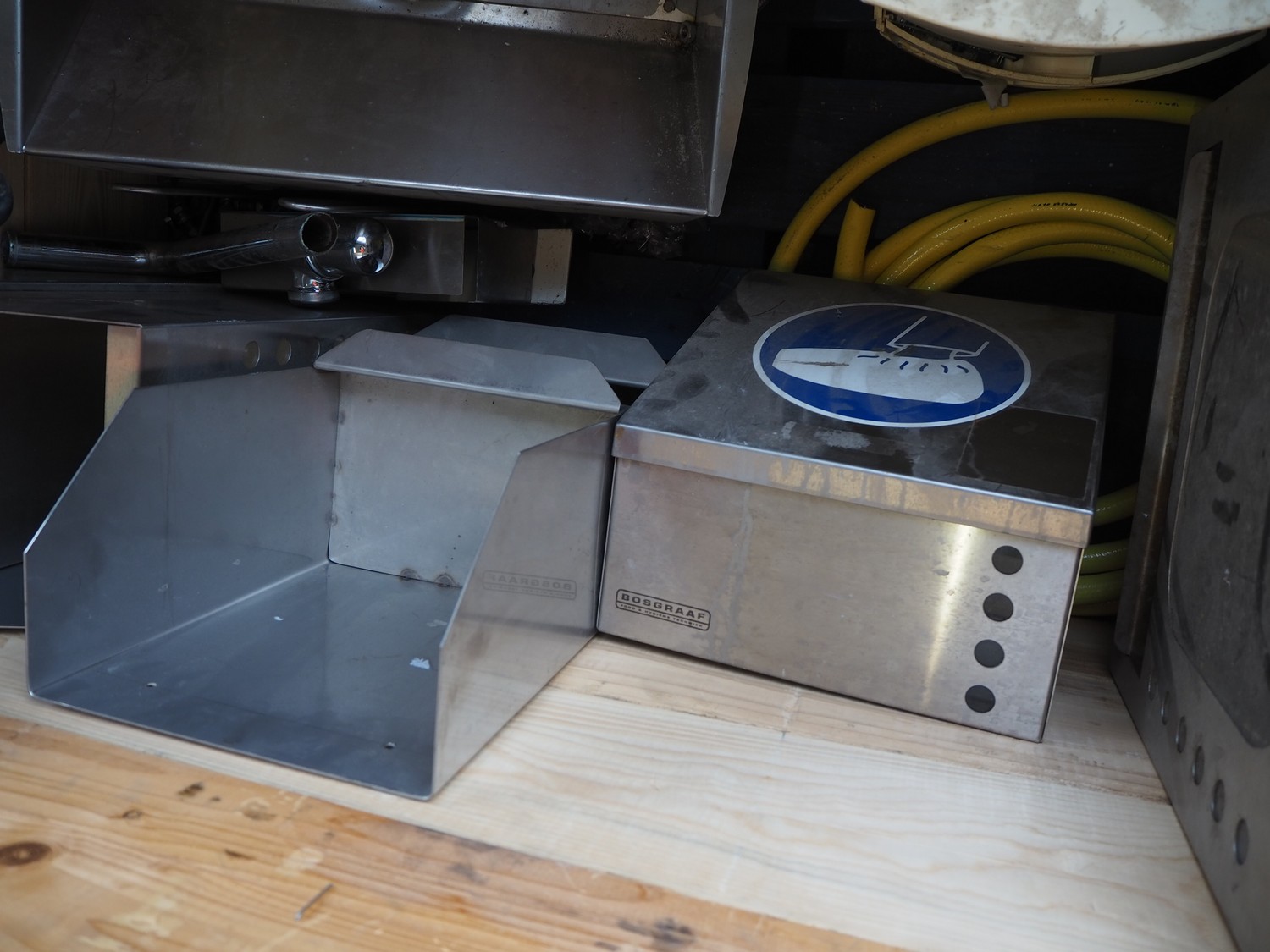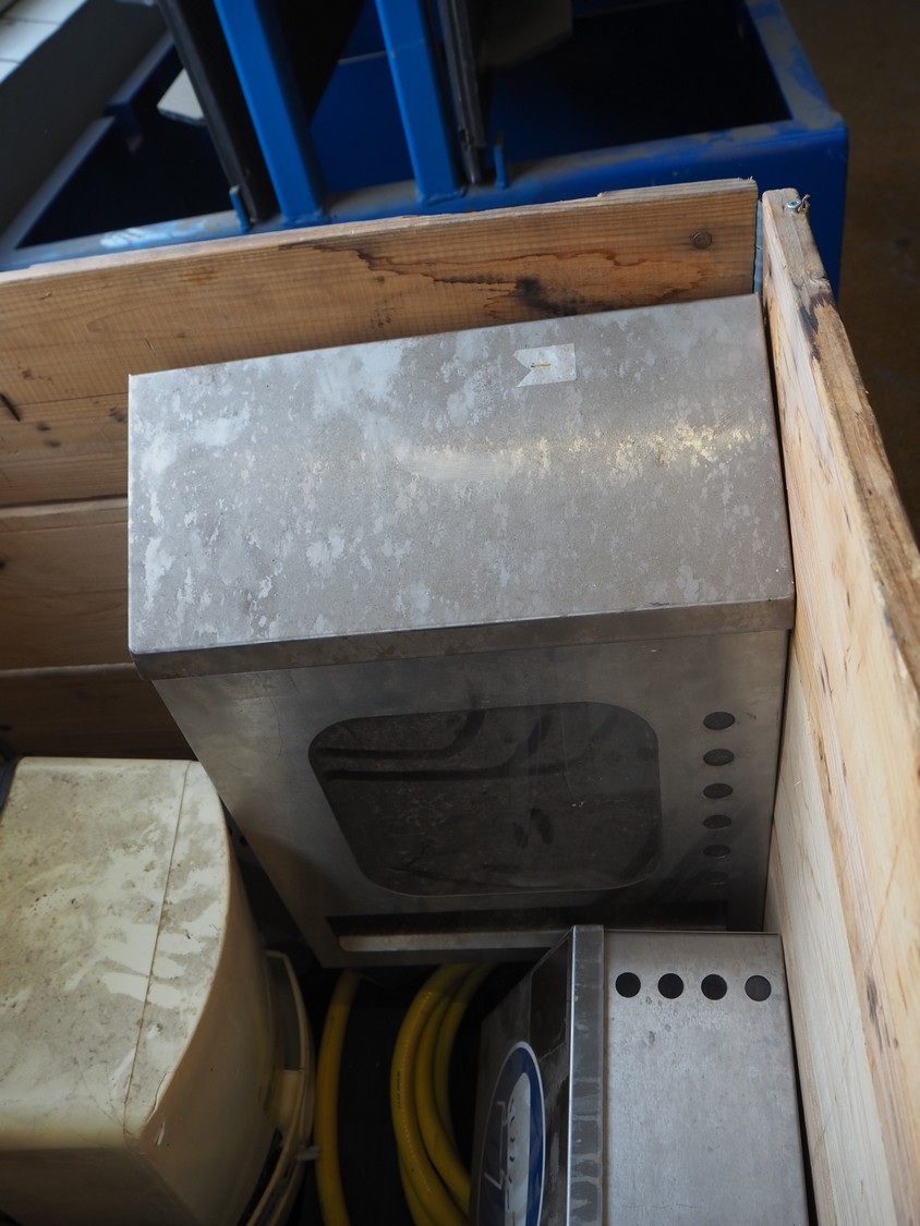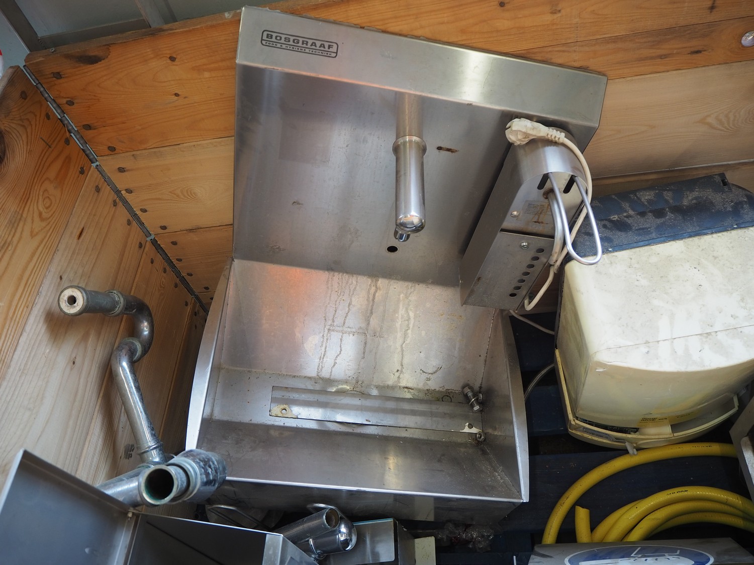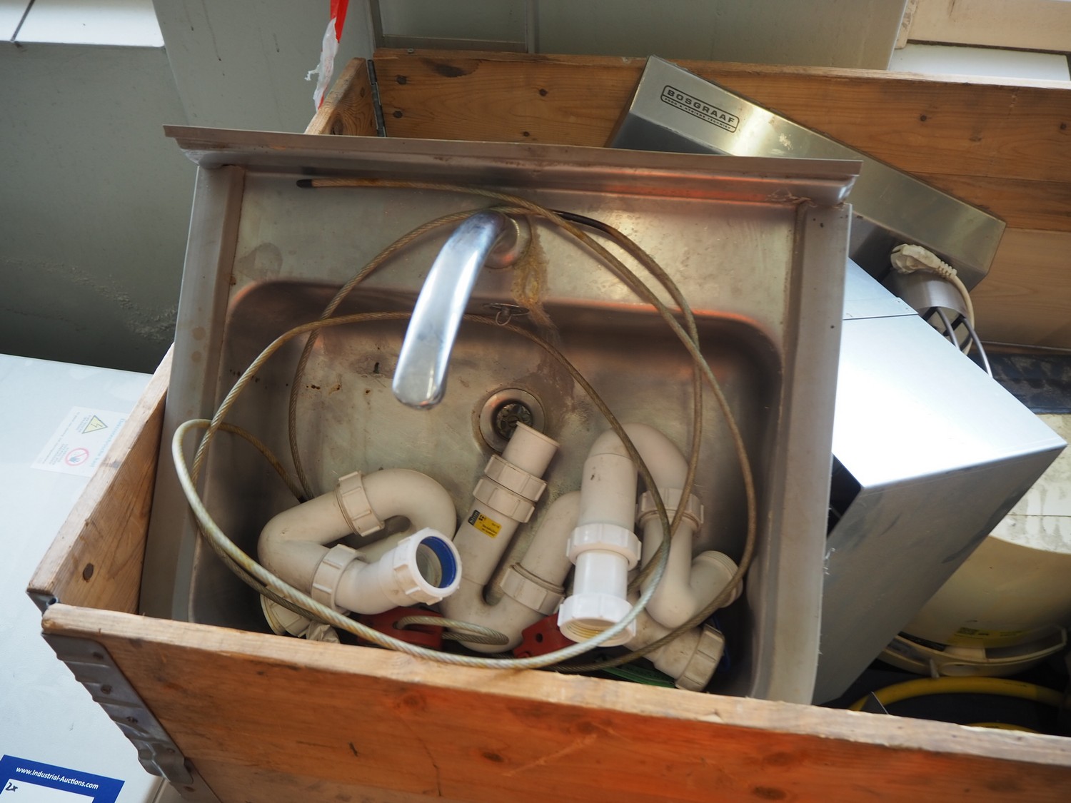 Wooden pallet box with Bosgraaf s/s sink and various s/s dispensers, dimensions: 1200 mm x 800 mm x 920 mm.